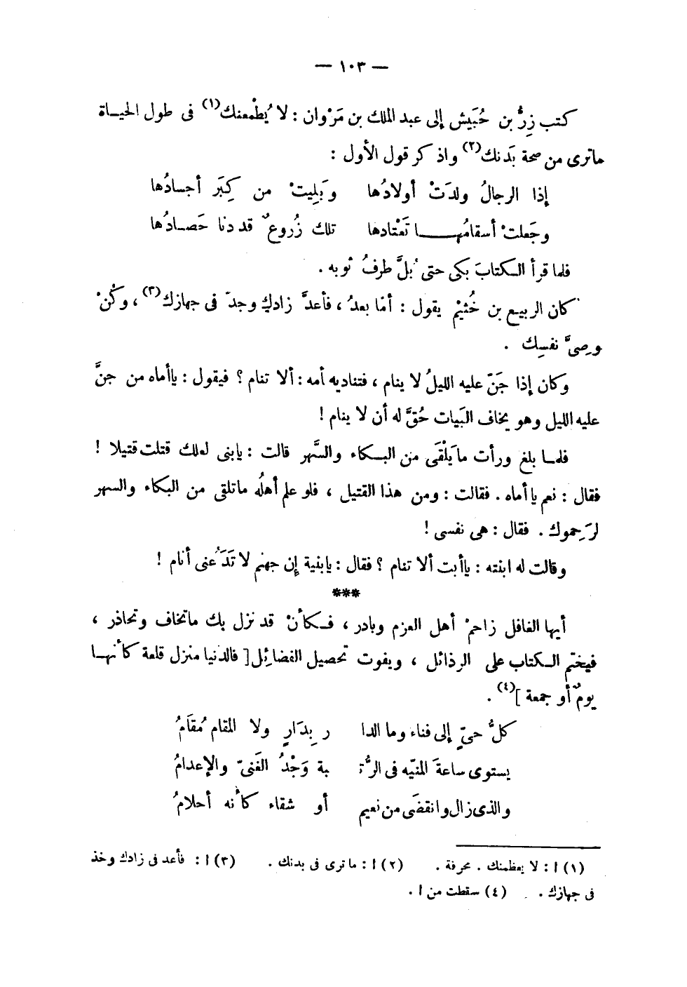 | | كتب زر بن حبش إلى عبد الملك بن مروان : لا يطمعنك في طول الحياة | ما ترى من صحة بدنك واذكر قول الأول : | | ( إذا الرجال ولدت أولادها % وبليت من كبر أجسادها ) % | | ( وجعلت أسقامها تعتادها % تلك زروع قد دنا حصادها ) % | | فلما قرأ الكتاب بكى حتى بل طرف ثوبه . | | كان الربيع بن خثيم يقول : أما بعد فأعد زادك وجد في جهازك , وكن | وصي نفسك . | | وكان إذا جن عليه الليل لا ينام , فتناديه أمه : ألا تنام ؟ فيقول : يا أماه من جن | عليه الليل وهو يخاف البيات حق له أن لا ينام ! | | فلما بلغ ورأت ما يلقى من البكاء والسهر قالت : يا بني لعلك قتلت قتيلاً ! | فقال : نعم يا أماه . فقالت : ومن هذا القتيل , فلو علم أهله ما تلقى من البكاء والسهر | لرحموك . فقال : هي نفسي ! | | وقالت له ابنته : يا أبت ألا تنام ؟ فقال : يا بنية إن جهنم لا تدعني أنام ! | | أيها الغافل زاحم أهل العزم وبادر , فكأن قد نزل بك ما تخاف وتحاذر , | فيختم الكتاب على الرذائل , ويفوت تحصيل الفضائل [ فالدنيا منزل قلعة كأنها | يوم أو جمعة ] . | | ( كل حي إلى فناء وما الدار % بدار ولا المقام مقام ) % | | ( يستوي ساعة المنية في الرتبة % وجد الغني والإعدام ) % | | ( والذي زال وانقضى من نعيم % أو شقاء كأنه أحلام ) % |