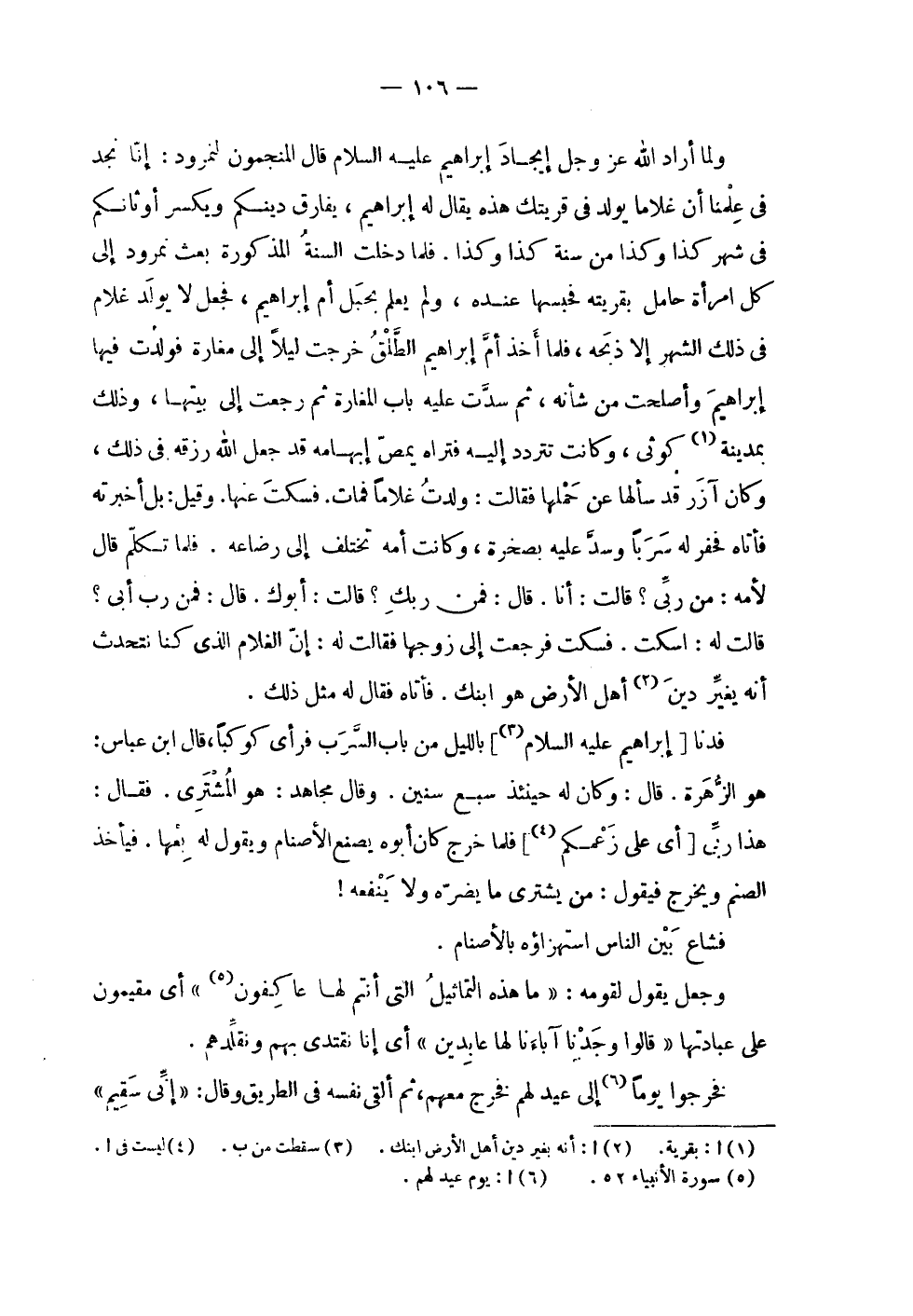 | | ولما أراد الله عز وجل إيجاد إبراهيم عليه السلام قال المنجمون لنمرود : إنا نجد | في علمنا أن غلاماً يولد في قريتك هذه يقال له إبراهيم , يفارق دينكم ويكسر أوثانكم | في شهر كذا وكذا من سنة كذا وكذا . فلما دخلت السنة المذكورة بعث نمرود إلى | كل امرأة حامل بقريته فحبسها عنده , ولم يعلم بحبل أم إبراهيم , فجعل لا يولد غلام | في ذلك الشهر إلا ذبحه , فلما أخذ أم إبراهيم الطلق خرجت ليلاً إلى مغارة فولدت فيها | إبراهيم وأصلحت من شأنه , ثم سدت عليه باب المغارة ثم رجعت إلى بيتها , وذلك | بمدينة كوثى , وكانت تتردد إليه فتراه يمص إبهامه قد جعل الله رزقه في ذلك , | وكان آزر قد سألها عن حملها فقالت : ولدت غلاماً فمات . فسكت عنها . وقيل : بل أخبرته | فأتاه فحفر له سرباً وسد عليه بصخرة , وكانت أمه تختلف إلى رضاعه . فلما تكلم قال | لأمه : من ربي ؟ قالت : أنا . قال : فمن ربك ؟ قالت : أبوك . قال : فمن رب أبي ؟ | قالت له : اسكت . فسكت فرجعت إلى زوجها فقالت له : إن الغلام الذي كنا نتحدث | أنه يغير دين أهل الأرض هو ابنك . فأتاه فقال له مثل ذلك . | | فدنا [ إبراهيم عليه السلام ] بالليل من باب السرب فرأى كوكباً , قال ابن عباس : | هو الزهرة . قال : وكان له حينئذ سبع سنين . وقال مجاهد : هو المشتري . فقال : | هذا ربي [ أي على زعمكم ] فلما خرج كان أبوه يصنع الأصنام ويقول له بعها . فيأخذ | الصنم ويخرج فيقول : من يشتري ما يضره ولا ينفعه ! | | فشاع بين الناس استهزاؤه بالأصنام . | | وجعل يقول لقومه : ! 2 < ما هذه التماثيل التي أنتم لها عاكفون > 2 ! أي مقيمون | على عبادتها ! 2 < قالوا وجدنا آباءنا لها عابدين > 2 ! أي إنا نقتدي بهم ونقلدهم . | | فخرجوا يوماً إلى عيد لهم فخرج معهم , ثم ألقى نفسه في الطريق وقال : ! 2 < إني سقيم > 2 ! |