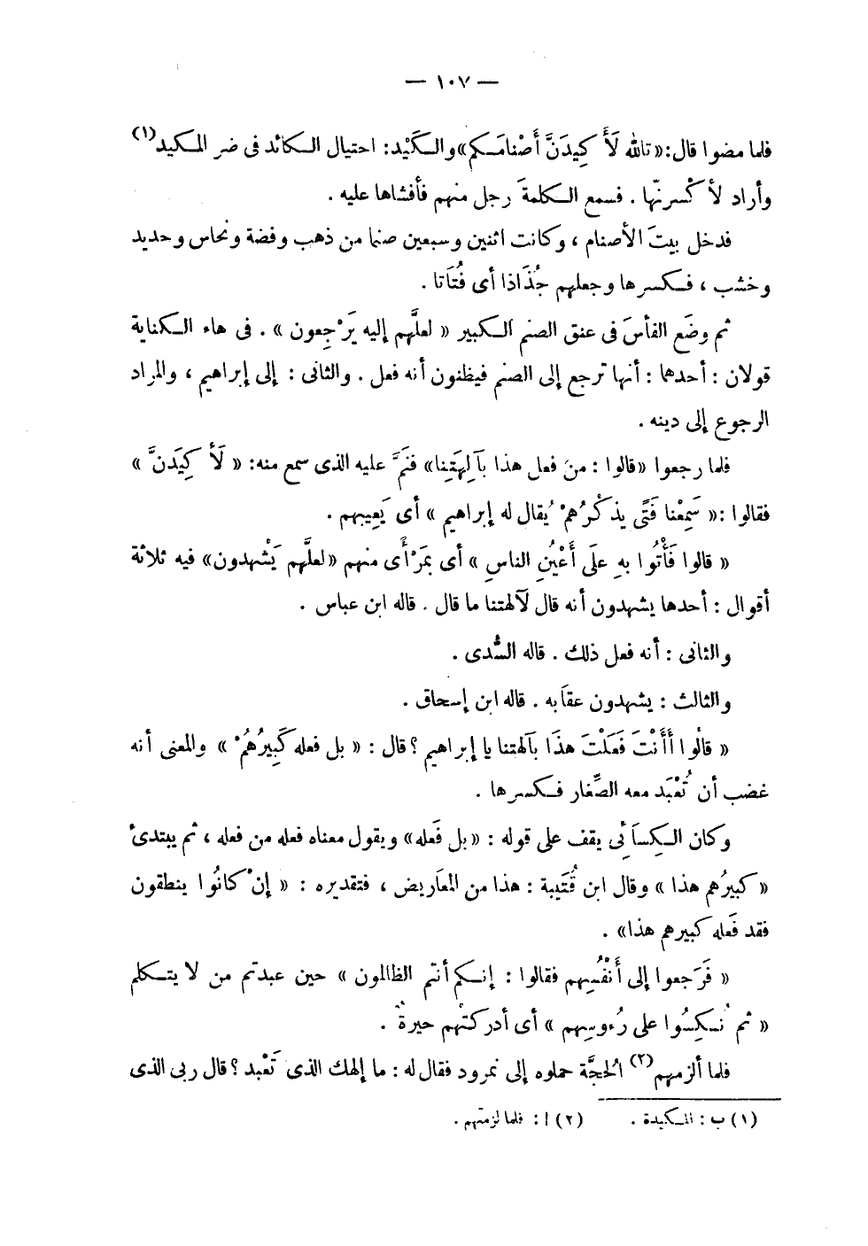 | فلما مضوا قال : ! 2 < تالله لأكيدن أصنامكم > 2 ! والكيد : احتيال الكائد في ضر الكيد | وأراد لأكسرنها . فسمع الكلمة رجل منهم فأفشاها عليه . | | فدخل بيت الأصنام , وكانت اثنين وسبعين صنماً من ذهب وفضة ونحاس وحديد | وخشب , فكسرها وجعلهم جذاذا أي فتاتا . | | ثم وضع الفأس في عنق الصنم الكبير ! 2 < لعلهم إليه يرجعون > 2 ! . في هاء الكناية | قولان : أحدهما : أنها ترجع إلى الصنم فيظنون أنه فعل . والثاني : إلى إبراهيم , والمراد | الرجوع إلى دينه . | | فلما رجعوا ' قالوا : من فعل هذا بآلهتنا ' فنم عليه الذي سمع منه : ! 2 < لأكيدن > 2 ! | فقالوا : ' سمعنا فتى يذكرهم يقال له إبراهيم ' أي يعيبهم . | | ! 2 < قالوا فأتوا به على أعين الناس > 2 ! أي بمرأى منهم ^ ( لعهلم يشهدون ) ^ فيه ثلاثة | اٌ قوال : أحدها يشهدون أنه قال لآلهتنا ما قال . قاله ابن عباس . | | والثاني : أنه فعل ذلك . قاله السدى . | | والثالث : يشهدون عقابه . قاله ابن إسحاق . | | ! 2 < قالوا أأنت فعلت هذا بآلهتنا يا إبراهيم > 2 ! قال : ! 2 < بل فعله كبيرهم > 2 ! والمعنى أنه | غضب أن تعبد معه الصغار فكسرها . | | وكان الكسائي يقف على قوله : ! 2 < بل فعله > 2 ! ويقول معناه فعله من فعله , ثم يبتدئ | ! 2 < كبيرهم هذا > 2 ! وقال ابن قتيبة : هذا من المعاريض , فتقديره : ^ ( إن كانوا ينطقون | فقد فعله كبيرهم هذا ) ^ . | | ! 2 < فرجعوا إلى أنفسهم فقالوا إنكم أنتم الظالمون > 2 ! حين عبدتم من لا يتكلم | ^ ( ثم نكسوا على رءوسهم ) ^ أي أدركتهم حيرة . | | فلما ألزمهم الحجة حملوه إلى نمرود فقال له : ما إلهك الذي تعبد ؟ قال ربي الذي |