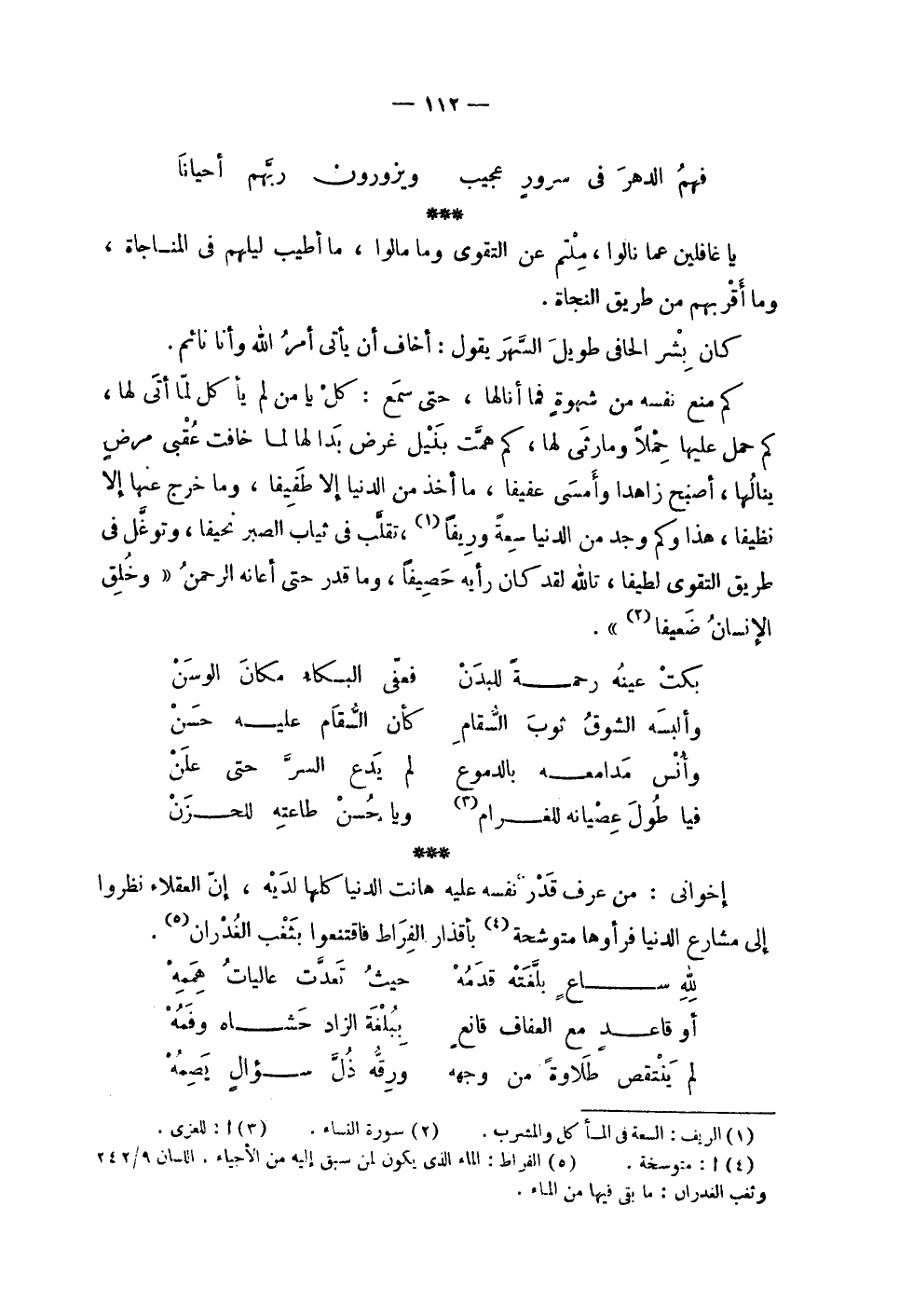 | | ( فهم الدهر في سرور عجيب % ويزورون ربهم أحياناً ) % | | يا غافلين عما نالوا , ملتم عن التقوى وما مالوا , ما أطيب ليلهم في المناجاة , | وما أقربهم من طريق النجاة . | | كان بشر الحافي طويل السهر يقول : أخاف أن يأتي أمر الله وأنا نائم . | | كم منع نفسه من شهوة فما أنالها , حتى سمع كل يا من لم يأكل لما أتى لها , | كم حمل عليها حملاً ومارثى لها , كم همت بنيل غرض بدا لها لما خافت عقبى مرض | ينالها , أصبح زاهداً وأمسى عفيفاً , ما أخذ من الدنيا إلا طفيفاً , وما خرج عنها إلا | نظيفاً , هذا وكم وجد من الدنيا سعة وريفاً , تقلب في ثياب الصبر نحيفاً , وتوغل في | طريق التقوى لطيفاً تالله لقد كان رأيه حصيفاً , وما قدر حتى أعانه الرحمن ! 2 < وخلق الإنسان ضعيفا > 2 ! . | | ( بكت عينه رحمة للبدن % فعفى البكاء مكان الوسن ) % | | ( وألبسه الشوق ثوب السقام % كأن السقام عليه حسن ) % | | ( وأنس مدامعه بالدموع % لم يدع السر حتى علن ) % | | ( فيا طول عصيانه للغرام % ويا حسن طاعته للحزن ) % | | إخواني : من عرف قدر نفسه عليه هانت الدنيا كلها لديه , إن العقلاء نظروا | إلى مشارع الدنيا فرأوها متوشحة بأقذار الفراط فاقتنعوا بثغب الغدران | | ( لله ساع بلغته قدمه % حيث تعدت عاليات هممه ) % | | ( أو قاعد مع العفاف قانع % ببلغة الزاد حشاه وفمه ) % | | ( لم ينتقص طلاوة من وجهه % ورقه ذلك سؤال يصمه ) % |