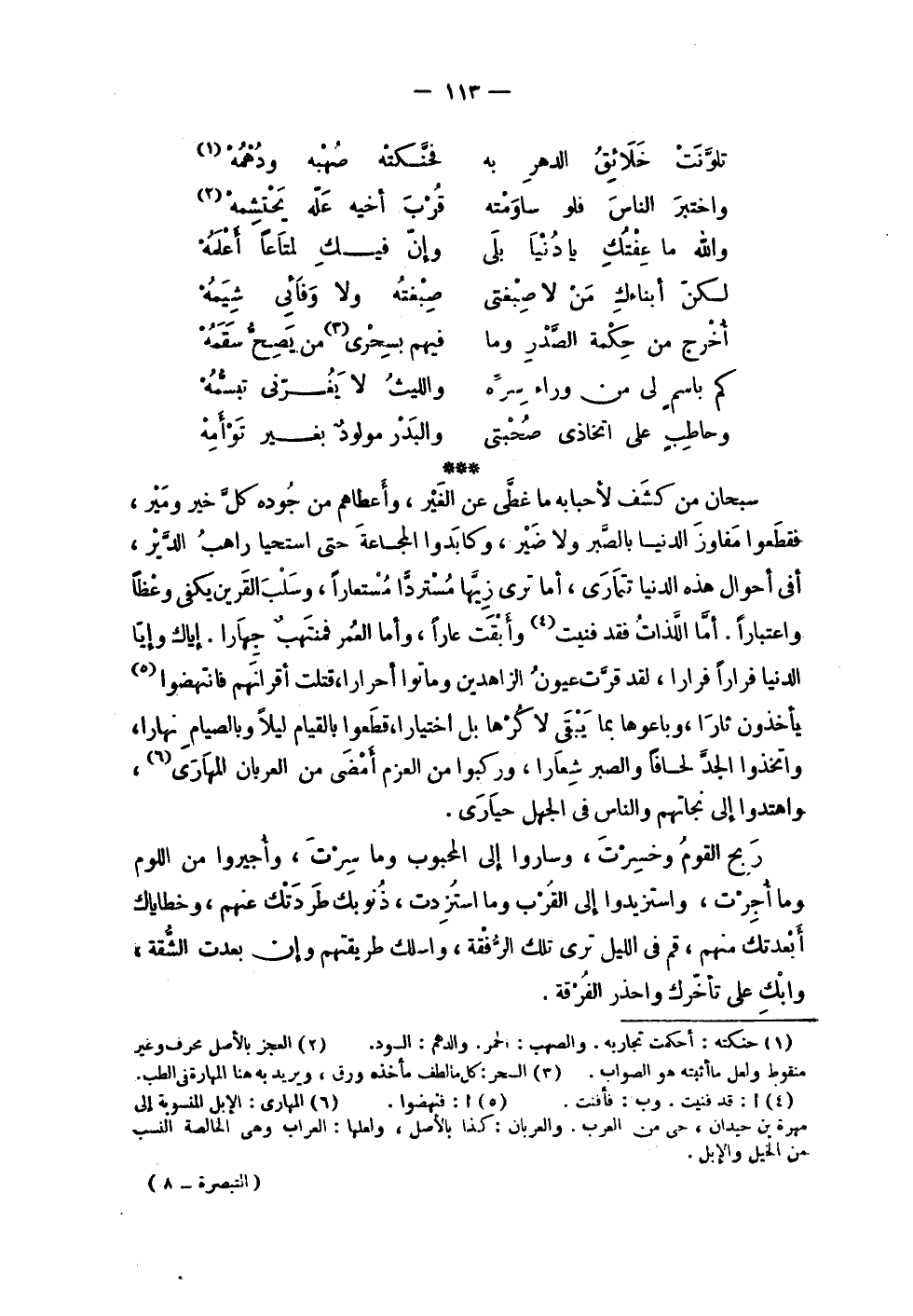 | | ( تلونت خلائق الدهر به % فحنكته صهبه ودهمه ) % | | ( واختبر الناس فلو ساومته % قرب أخيه علة يحتشمه ) % | | ( والله ما عفتك يا دنيا بلى % وإن فيك لمتاعاً أعلمه ) % | | ( لكن أبناءك من لا صبغتي % صبغته ولا وفائي شيمه ) % | | ( أخرج من حكمة الصدر وما % فيهم بسحري من يصح سقمه ) % | | ( كم باسم لي من وراء سره % والليث لا يغرني تبسمه ) % | | ( وحاطب على اتخاذي صحبتي % والبدر مولود بغير توأمه ) % | | سبحان من كشف لأحبابه ما غطى عن الغير , وأعطاهم من جوده كل خير ومير , | فقطعوا مفاوز الدنيا بالصبر ولا ضير , وكابدوا المجاعة حتى استحيا راهب الدير , | أفي أحوال هذه الدنيا تمارى , أما ترى زيها مسترداً مستعاراً , وسلب القرين يكفي وعظاً | واعتباراً . أما اللذات فقد فنيت وأبقت عاراً , وأما العمر فمنتهب جهاراً . إياك وإيا | الدنيا فراراً فراراً , لقد قرت عيون الزاهدين وماتوا أحراراً , قتلت أقرانهم فانتهضوا | يأخذون ثاراً , وباعوها بما يبقى لا كرها بل اختياراً , قطعوا بالقيام ليلاً وبالصيام نهاراً , | واتخذوا الجد لحافاً والصبر شعاراً , وركبوا من العزم أمضى من العربان المهارى , | واهتدوا إلى نجاتهم والناس في الجهل حيارى . | | ربح القوم وخسرت , وساروا إلى المحبوب وما سرت , وأجيروا من اللوم | وما أجرت , واستزيدوا إلى القرب وما استزدت , ذنوبك طردتك عنهم , وخطاياك | أبعدتك منهم , قم في الليل ترى تلك الرفقة , واسلك طريقتهم وإن بعدت الشقة , | وابك على تأخرك واحذر الفرقة . |