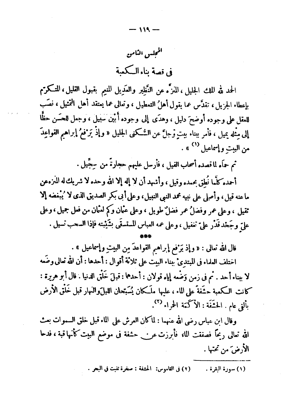| المجلس الثامن | في قصة بناء الكعبة | | الحمد لله الملك الجليل , المنزه عن النظير والعديل المنعم بقبول القليل , المتكرم | بإعطاء الجزيل , تقدس عما يقول أهل التعطيل , وتعالى عما يعتقد أهل التمثيل , نصب | للعقل على وجوده أوضح دليل , وهدى إلى وجوده أبين سبيل , وجعل للحسن حظاً | إلى مثله يميل , فأمر ببناء بيت وجل عن السكنى الجليل ' وإذا يرفع إبراهيم القواعد | من البيت وإسماعيل ' . | | ثم حماه لما قصده أصحاب الفيل , فأرسل عليهم حجارة من سجيل . | | أحمده كلما نطق بحمده وقيل , وأشهد أن لا إله إلا الله وحده لا شريك له المنزه عن | ما عنه قيل , وأصلي على نبيه محمد النبي النبيل , وعلى أبي بكر الصديق الذي لا يبغضه إلا | ثقيل , وعلى عمر وفضل عمر فضل طويل , وعلى عثمان وكم لعثمان من فعل جميل , وعلى | علي وجحد قدر على تغفيل , وعلى عمه العباس المستسقى بشيبته فإذا السحب تسيل . | | قال الله تعالى : ! 2 < وإذ يرفع إبراهيم القواعد من البيت وإسماعيل > 2 ! | | اختلف العلماء في المبتدئ ببناء البيت على ثلاثة أقوال : أحدها : أن الله تعالى وضعه | لا ببناء أحد . ثم في زمن وضعه إياه قولان : أحدهما : قبل خلق الدنيا . قال أبو هريرة : | كانت الكعبة حشفة على الماء , عليها ملكان يسبحان الليل والنهار قبل خلق الأرض | بألفي عام . الحشفة : الأكمة الحمراء . | | وقال ابن عباس رضي الله عنهما : لما كان العرش على الماء قبل خلق السماوات بعث | الله تعالى ريحاً فصفقت الماء فأبرزت عن حشفة في موضع البيت كأنها قبة , فدحا | الأرض من تحتها . |