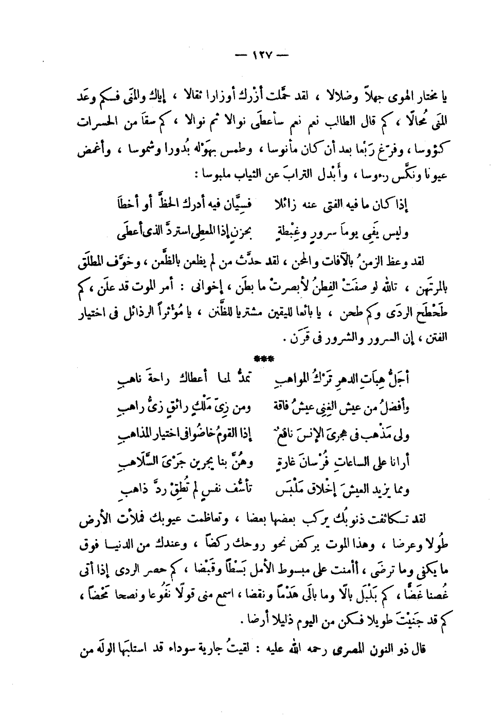 | يا مختار الهوى جهلاً وضلالاً , لقد حملت أزرك أوزاراً ثقالاً , إياك والمنى فكم وعد | المنى محالاً , كم قال الطالب نعم نعم سأعطى نوالاً ثم نوالاً , كم سقا من الحسرات | كؤوساً , وفرغ ربعا بعد أن كان مأنوساً , وطمس بهوله بدوراً وشموساً , وأغمض | عيوناً ونكس رءوساً , وأبدل التراب عن الثياب ملبوساً : | | ( إذا كان ما فيه الفتى عنه زائلاً % فسيان فيه أدرك الحظ أو أخطا ) % | | ( وليس يفي يوماً سرور وغبطة % بحزن إذا المعطي استرد الذي أعطى ) % | | لقد وعظ الزمن بالآفات والمحن , لقد حدث من لم يظعن بالظعن , وخوف المطلق | بالمرتهن , تالله لو صفت الفطن لأبصرت ما بطن , إخواني : أمر الموت قد علن , كم | طحطح الردى وكم طحن , يا بائعاً لليقين مشترياً للظنن , يا مؤثراً الرذائل في اختيار | الفتن , إن السرور والشرور في قرن . | | ( أجل هبات الدهر ترك المواهب % تمد لما أعطاك راحة ناهب ) % | | ( وأفضل من عيش الغنى عيش فاقة % ومن زي ملك رائق زي راهب ) % | | ( ولي مذهب في هجري الإنس نافع % إذا القوم خاضوا في اختيار المذاهب ) % | | ( أرانا على الساعات فرسان غارة % وهن بنا يجرين جري السلاهب ) % | | ( ومما يزيد العيش إخلاق ملبس % تأسف نفس لم تطق رد ذاهب ) % | | لقد تكاثفت ذنوبك يركب بعضها بعضا , وتعاظمت عيوبك فملأت الأرض | طولاً وعرضاً , وهذا الموت يركض نحو روحك ركضاً , وعندك من الدنيا فوق | ما يكفي وما ترضى , أأمنت على مبسوط الأمل بسطاً وقبضاً , كم حصر الردى إذا أتى | غصناً غصاً , كم بلبل بالاً وما بالي هدماً ونقضاً , اسمع مني قولاً نفوعاً ونصحاً محضاً , | كم قد جنيت طويلاً فكن من اليوم ذليلاً أرضاً . | | قال ذو النون المصري رحمة الله عليه : لقيت جارية سوداء قد استلبها الوله من |