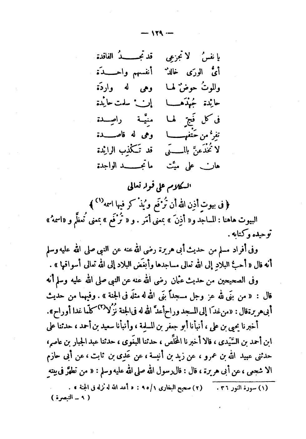 | | ( يا نفس لا تجزعي % قد تجد الفاقدة ) % | | ( أي الورى خالد % أنفسهم واحدة ) % | | ( والموت حوض لها % وهي له واردة ) % | | ( حائدة جهدها % إن سلمت حائدة ) % | | ( في كل فج لها % منية راصدة ) % | | ( تفر من حتفها % وهي له قاصدة ) % | | ( لا تخدعن بالمنى % قد تكذب الرائدة ) % | | ( هان على ميت % ما تجد الواجدة ) % | الكلام على قوله تعالى | ! 2 < في بيوت أذن الله أن ترفع ويذكر فيها اسمه > 2 ! | | البيوت هاهنا : المساجد و ! 2 < إذن > 2 ! بمعنى أمر . و ! 2 < ترفع > 2 ! بمعنى تعظم و ! 2 < اسمه > 2 ! | توحيده وكتابه . | | وفي أفراد مسلم من حديث أبي هريرة رضي الله عنه عن النبي صلى الله عليه وسلم | أنه قال ' أحب البلاد إلى الله تعالى مساجدها وأبغض البلاد إلى الله تعالى أسواقها ' . | | وفي الصحيحين من حديث عثمان رضي الله عنه عن النبي صلى الله عليه وسلم أنه | قال : ' من بنى لله عز وجل مسجداً بنى الله له مثله في الجنة ' . وفيهما من حديث | أبي هريرة قال : ' من غدا إلى المسجد وراح أعد الله له في الجنة نزلا كلما غدا أو راح ' . | | أخبرنا يحيى بن علي ، أنبأنا أبو جعفر بن المسلمة , وأنبأنا سعيد بن أحمد , حدثنا علي | ابن أحمد بن السيدي , قالا أخبرنا المخلص , حدثنا البغوي , حدثنا عبد الجبار بن عاصم , | حدثني عبيد الله بن عمرو , عن زيد بن أنيسة , عن عدي بن ثابت , عن أبي حازم | الأشجعي , عن أبي هريرة , قال : قال رسول الله صلى الله عليه وسلم : ' من تطهر في بيته |