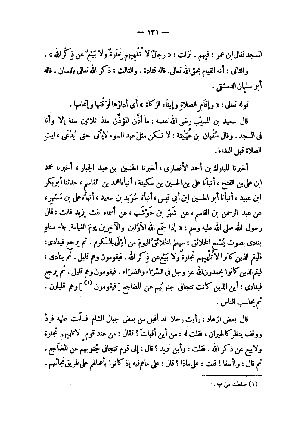 | المسجد فقال ابن عمر : فيهم . نزلت : ! 2 < رجال لا تلهيهم تجارة ولا بيع عن ذكر الله > 2 ! . | | والثاني : أنه القيام بحق الله تعالى . قاله قتادة . والثالث : ذكر الله تعالى باللسان . قاله | أبو سليمان الدمشقي . | | قوله تعالى : ! 2 < وإقام الصلاة وإيتاء الزكاة > 2 ! أي أداؤها لوقتها وإتمامها . | | قال سعيد بن المسيب رضي الله عنه : ما أذن المؤذن منذ ثلاثين سنة إلا وأنا | في المسجد . وقال سفيان بن عيينة : لا تكن مثل عبد السوء لا يأتي حتى يدعى , ايت | الصلاة قبل النداء . | | أخبرنا المبارك بن أحمد الأنصاري , أخبرنا الحسين بن عبد الجبار , أخبرنا محمد | ابن علي بن الفتح , أنبأنا علي بن الحسين بن سكينة , أنبأنا محمد بن القاسم , حدثنا أبو بكر | ابن عبيد , أنبأنا أبو الحسين ابن أبي قيس , أنبأنا سويد بن سعيد , أنبأنا علي بن مسهر , | عن عبد الرحمن بن القاسم , عن شهر بن حوشب , عن أسماء بنت يزيد قالت : قال | رسول الله صلى الله عليه وسلم : ' إذا جمع الله الأولين والآخرين يوم القيامة . جاء مناد | ينادي بصوت يسمع الخلائق : سيعلم الخلائق اليوم من أولى بالكرم . ثم يرجع فينادي : | فليقم الذين كانوا يحمدون الله عز وجل في السراء والضراء . فيقومون وهم قليل . ثم يرجع | فينادي : أين الذين كانت تتجافى جنوبهم عن المضاجع [ فيقومون ] وهم قليلون . | ثم يحاسب الناس . | | قال بعض الزهاد : رأيت رجلاً قد أقبل من بعض جبال الشام فسلمت عليه فرد | ووقف ينظر كالحيران , فقلت له : من أين أقبلت . فقال : من عند قوم لا تلهيهم تجارة | ولا بيع عن ذكر الله . فقلت : وأين تريد ؟ قال : إلى قوم تتجافى جنوبهم عن المضاجع . | ثم قال : واأسفاً ! قلت : على ماذا ؟ قال : على ما هم فيه إذ كانوا بأعمالهم على طريق نجاتهم . |