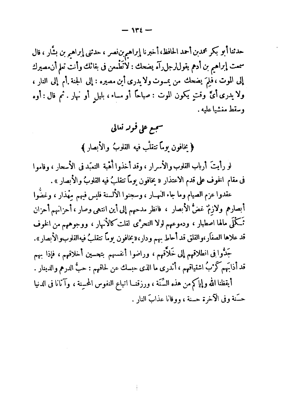 | حدثنا أبو بكر محمد بن أحمد الحافظ , أخبرنا إبراهيم بن نصر , حدثني إبراهيم بن بشار , قال | سمعت إبراهيم بن أدهم يقول لرجل رآه يضحك : لا تطمعن في بقائك وأنت تعلم أن مصيرك | إلى الموت , فلم يضحك من يموت ولا يدري أين مصيره : إلى الجنة أم إلى النار , | ولا يدري أي وقت يكون الموت : صباحاً أو مساء ، بليل أو نهار . ثم قال : أوه | وسقط مغشياً عليه . | سجع على قوله تعالى | ! 2 < يخافون يوما تتقلب فيه القلوب والأبصار > 2 ! | لو رأيت أرباب القلوب والأسرار , وقد أخذوا أهبة التعبد في الأسحار , وقاموا | في مقام الخوف على قدم الإعتذار ! 2 < يخافون يوما تتقلب فيه القلوب والأبصار > 2 ! . | | عقدوا عزم الصيام وما جاء النهار , وسجنوا الألسنة فليس فيهم مهذار , وغضوا | أبصارهم ولازم غض الأبصار , فانظر مدحهم إلى أين انتهى وصار , أحزانهم أحزان | ثكلى ما لهذا اصطبار , ودموعهم لولا التحري لقلت كالأنهار , ووجوههم من الخوف | قد علاها الصفار , والقلق قد أحاط بهم ودار , ! 2 < يخافون يوما تتقلب فيه القلوب والأبصار > 2 ! . | | جدوا في انطلاقهم إلى خلاقهم , وراضوا أنفسهم بتحسين أخلاقهم , فإذا بهم | قد أذابهم كرب اشتياقهم , أتدري ما الذي حبسك عن لحاقهم : حب الدرهم والدينار . | | أيقظنا الله وإياكم من هذه السنة , ورزقنا اتباع النفوس المحسنة , وآتانا في الدنيا | حسنة وفي الآخرة حسنة , ووقانا عذاب النار . |