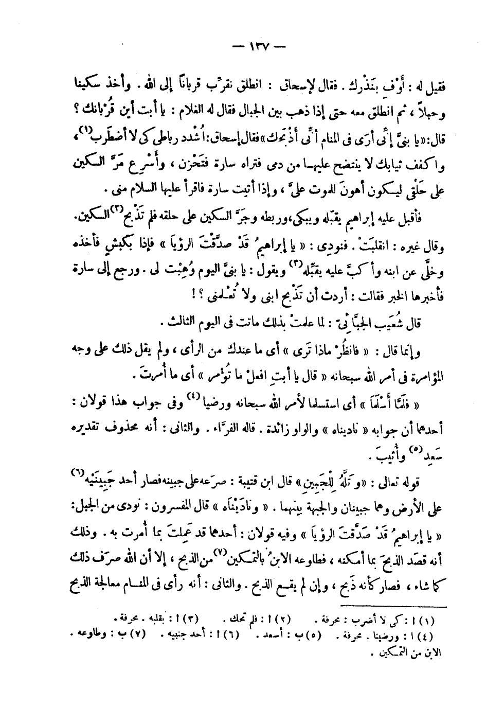 | فقيل له : أوف بنذرك . فقال لإسحاق : انطلق نقرب قرباناً إلى الله . وأخذ سكيناً | وحبلاً , ثم انطلق معه حتى إذا ذهب بين الجبال فقال له الغلام : يا أبت أين قربانك ؟ | قال : ' يا بني إني أرى في المنام أني أذبحك ' فقال إسحاق : اشدد رباطي كي لا أضطرب , | واكفف ثيابي لا ينتضح عليها من دمي فتراه سارة فتحزن , وأٍ سرع مر السكين | على حلقي ليكون أهون للموت علي , وإذا أتيت سارة فاقرأ عليها السلام مني . | | فأقبل عليه إبراهيم يقبله ويبكي , وربطه وجر السكين على حلقه فلم تذبح السكين . | وقال غيره : انقلبت . فنودي : ' يا إبراهيم قد صدقت الرؤيا ' فإذا بكبش فأخذه | وخلى عن ابنه وأكب عليه يقبله ويقول : يا بني اليوم وهبت لي . ورجع إلى سارة | فأخبرها الخبر فقالت : أردت أن تذبح ابني ولا تعلمني ؟ ! | | قال شعيب الجبائي : لما علمت بذلك ماتت في اليوم الثالث . | | وإنما قال : ' فانظر ماذا ترى ' أي ما عندك من الرأي , ولم يقل ذلك على وجه | المؤامرة في أمر الله سبحانه ' قال يا أبت افعل ما تؤمر ' أي ما أمرت . | | ' فلما أسلما ' أي استسلما لأمر الله سبحانه ورضيا وفي جواب هذا قولان : | أحدهما أن جوابه ' ناديناه ' والواو زائدة . قاله الفراء . والثاني : أنه محذوف تقديره | سعد وأثيب . | | قوله تعالى : ! 2 < وتله للجبين > 2 ! قال ابن قتيبة : صرعه على جبينه فصار على أحد جبينيه | على الأرض وهما جبينان والجبهة بينهما . ! 2 < وناديناه > 2 ! قال المفسرون : نودي من الجبل : | ! 2 < يا إبراهيم قد صدقت الرؤيا > 2 ! وفيه قولان : أحدهما قد عملت بما أمرت به . وذلك | أنه قصد الذبح بما أمكنه , فطاوعه الابن بالتمكين من الذبح , إلا أن الله صرف ذلك | كما شاء , فصار كأنه ذبح , وإن لم يقع الذبح . والثاني : أنه رأى في المنام معالجة الذبح |