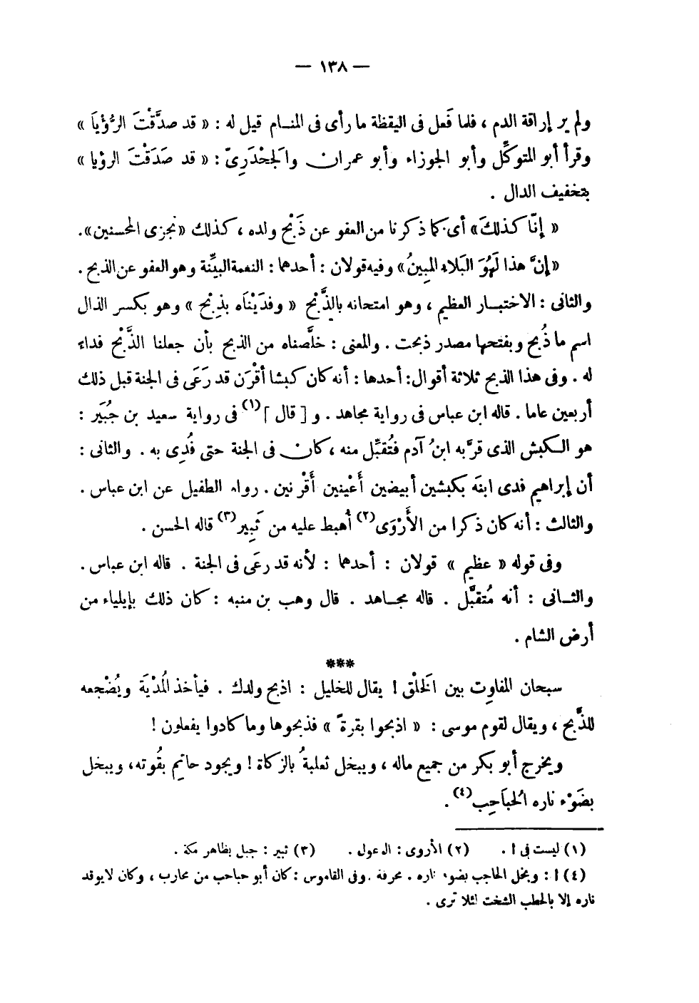 | | ولم ير إراقة الدم , فلما فعل في اليقظة ما رأى في المنام قيل له : ' قد صدقت الرؤيا ' | وقرأ أبو المتوكل وأبو الجوزاء وأبو عمران والجحدري : ' قد صدقت الرؤيا ' | بتخفيف الدال . | | ! 2 < إنا كذلك > 2 ! أي كما ذكرنا من العفو عن ذبح ولده , كذلك ! 2 < نجزي المحسنين > 2 ! . | | ! 2 < إن هذا لهو البلاء المبين > 2 ! وفيه قولان : أحدهما : النعمة البينة وهو العفو عن الذبح . | والثاني : الاختبار العظيم , وهو امتحانه بالذبح ! 2 < وفديناه بذبح > 2 ! وهو بكسر الذال | اسم ما ذبح وبفتحها مصدر ذبحت . والمعنى : خلصناه من الذبح بأن جعلنا الذبح فداء | له . وفي هذا الذبح ثلاثة أقوال : أحدها : أنه كان كبشاً أقرن قد رعى في الجنة قبل ذلك | أربعين عاماً . قاله ابن عباس في رواية مجاهد . و [ قال ] في رواية سعيد بن جبير : | هو الكبش الذي قربه ابن آدم فتقبل منه , كان في الجنة حتى فدي به . والثاني : | أن إبراهيم فدى ابنه بكبشين أبيضين أعينين أقرنين . رواه الطفيل عن ابن عباس . | والثالث : أنه كان ذكراً من الأروى أهبط عليه من ثبير قاله الحسن . | | وفي قوله ! 2 < عظيم > 2 ! قولان : أحدهما : لأنه قد رعى في الجنة . قاله ابن عباس . | والثاني : أنه متقبل . قاله مجاهد . قال وهب بن منبه : كان ذلك بإيلياء من | أرض الشام . | | سبحان المفاوت بين الخلق ! يقال للخليل : اذبح ولدك . فيأخذ المدية ويضجعه | للذبح , ويقال لقوم موسى : ^ ( اذبحوا بقرة ) ^ فذبحوها وما كادوا يفعلون ! | | ويخرج أبو بكر من جميع ماله , ويبخل ثعلبة بالزكاة ! ويجود حاتم بقوته , ويبخل | بضوء ناره الحُباحِب . |