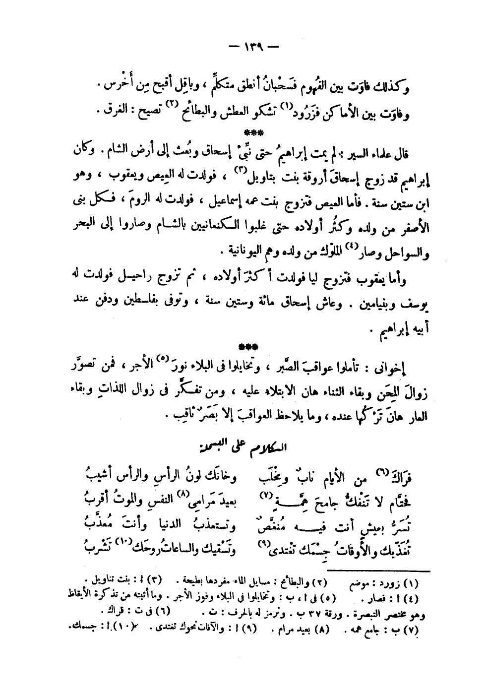 | | وكذلك فاوت بين الفهوم فسحبان أنطق متكلم , وباقل أقبح من أخرس . | | وفاوت بين الأماكن فزرود تشكو العطش والبطائح تصيح : الغرق . | | قال علماء السير : لم يمت إبراهيم حتى نبىء إسحاق وبعث إلى أرض الشام . وكان | إبراهيم قد زوج إسحاق أروقة بنت بتاويل , فولدت له العيص ويعقوب , وهو | ابن ستين سنة . فأما العيص فتزوج بنت عمه إسماعيل , فولدت له الروم , فكل بني | الأصفر من ولده وكثر أولاده حتى غلبوا الكنعانيين بالشام وصاروا إلى البحر | والسواحل وصار الملوك من ولده وهم اليونانية . | | وأما يعقوب فتزوج ليا فولدت أكثر أولاده , ثم تزوج راحيل فولدت له | يوسف وبنيامين . وعاش إسحاق مائة وستين سنة , وتوفي بفلسطين ودفن عند | أبيه إبراهيم . | | إخواني : تأملوا عواقب الصبر , وتخايلوا في البلاء نور الأجر , فمن تصور | زوال المحن وبقاء الثناء هان الابتلاء عليه , ومن تفكر في زوال اللذات وبقاء | العار هان تركها عنده , وما يلاحظ العواقب إلا بصر ثاقب . | الكلام على البسملة | | ( فراك من الأيام ناب ومخلب % وخانك لون الرأس والرأس أشيب ) % | | ( فحتام لا تنفك جامح همة % بعيد مرامي النفس والموت أقرب ) % | | ( تسر بعيش أنت فيه منغص % وتستعذب الدنيا وأنت معذب ) % | | ( تغذيك والأوقات جسمك تغتدي % وتسقيك والساعات روحك تشرب ) % |