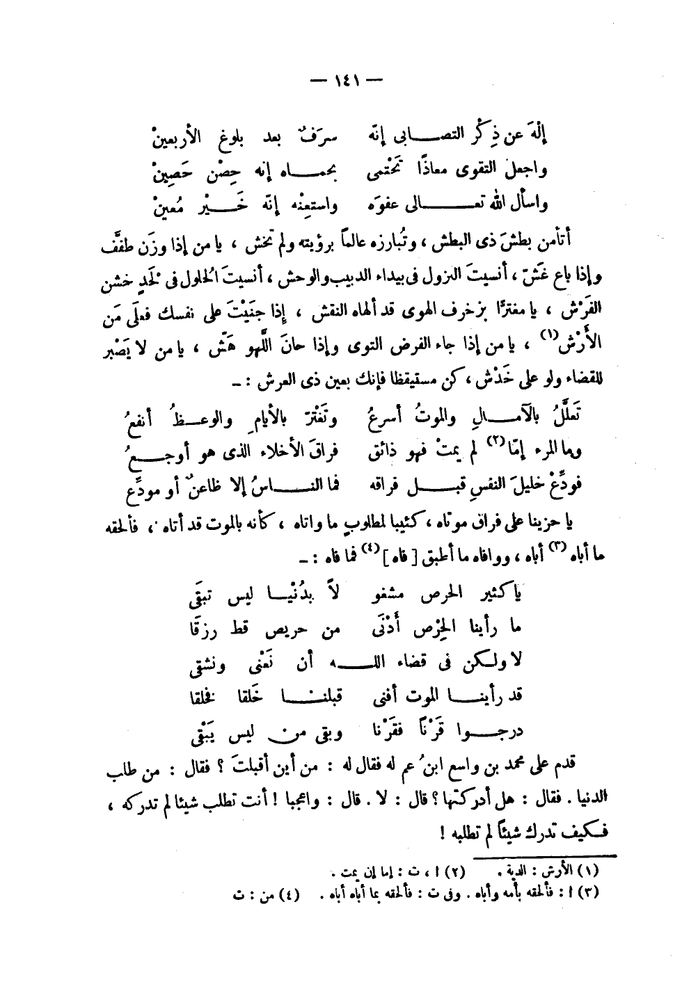 | | ( إله عن ذكر التصابي إنه % سرف بعد بلوغ الأربعين ) % | | ( واجعل التقوى معاذاً تحتمي % بحماه إنه حصن حصين ) % | | ( واسأل الله تعالى عفوه % واستعنه إنه خير معين ) % | | أتأمن بطش ذي البطش , وتبارزه عالماً برؤيته ولم تخش , يا من إذا وزن طفف | وإذا باع غش , أنسيت النزول في بيداء الدبيب والوحش , أنسيت الحلول في لحد خشن | الفرش , يا مغتراً بزخرف الهوى قد ألهاه النقش , إذا جنيت على نفسك فعلى من | الأرش , يا من إذا جاء الفرض التوى وإذا حان اللهو هش , يا من لا يصبر | للقضاء ولو على خدش , كن مستيقظاً فإنك بعين ذي العرش : | | ( تعلل بالآمال والموت أسرع % وتغتر بالأيام والوعظ أنفع ) % | | ( وما المرء إما لم يمت فهو ذائق % فراق الأخلاء الذي هو أوجع ) % | | ( فودع خليل النفس قبل فراقه % فما الناس إلا ظاعن أو مودع ) % | | يا حزيناً على فراق موتاه , كئيباً لمطلوب ما واتاه , كأنه بالموت قد أتاه , فألحقه | ما أباه أباه , ووافاه ما أطيق [ فاه ] فما فاه : | | ( يا كثير الحرص مشغولاً % بدنيا ليس تبقى ) % | | ( ما رأينا الحرص أدنى % من حريص قط رزقا ) % | | ( لا ولكن في قضاء الله % أن نعنى ونشقى ) % | | ( قد رأينا الموت أفنى % قبلنا خلقا فخلقا ) % | | ( درجوا قرناً فقرنا % وبقي من ليس يبقى ) % | | قدم على محمد بن واسع ابن عم له فقال له : من أين أقبلت ؟ فقال : من طلب | الدنيا . فقال : هل أدركتها ؟ قال : لا . قال : واعجبا ! أنت تطلب شيئاً لم تدركه , | فكيف تدرك شيئاً لم تطلبه . |