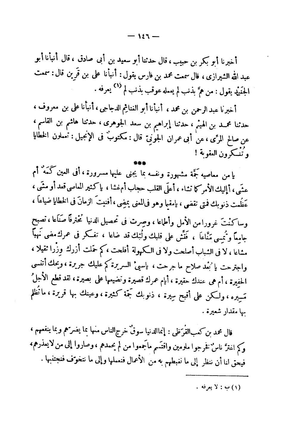 | | أخبرنا أبو بكر بن حبيب , قال حدثنا أبو سعيد بن أبي صادق , قال أنبأنا أبو | عبد الله الشيرازي , قال سمعت محمد بن فارس يقول : أنبأنا علي بن قرين قال : سمعت | الجنيد يقول : من هم بذنب لم يعمله عوقب بذنب لم يعرفه . | | أخبرنا عبد الرحمن بن محمد , أنبأنا أبو الغنائم الدجاجي , أنبأنا علي بن معروف , | حدثنا محمد بن الهيثم حدثنا إبراهيم بن سعد الجوهري , حدثنا هاشم بن القاسم , | عن صالح المري , عن أبي عمران الجوني قال : مكتوب في الإنجيل : تعملون الخطايا | وتنكرون العقوبة ! | | يا من معاصيه جمة مشهورة ونفسه بما يجني عليها مسرورة , أفي العين كمه أم | عشي , أإليك الأمر كما تشاء , أعلى القلب حجاب أم غشا , يا كثير المعاصي قعد أو مشى , | عظمت ذنوبك فمتى تقضي , يا مقيما وهو في المعنى يمضي , أفنيت الزمان في الخطايا ضياعاً , | وساكنت غروراً من الامل وأطماعاً , وصرت في تحصيل الدنيا محترفاً صناعا , تصبح | جامعاً وتمسي مناعا , فتش على قلبك ولبك قد ضاعا تفكر في عمرك مضى نهباً , | مشاعا لا في الشباب أصلحت ولا في الكهولة أفلحت , كم حملت أزرك وزراً ثقيلاً , | واجترحت يا بعد صلاح ما جرحت ، يا سيء السريرة كم عليك جريرة , ويحك أتنسى | الحفيرة , أم هي عندك حقيرة , أيام عمرك قصيرة وتضيعها على بصيرة لقد قطع الأجل | مسيره ولكن على أقبح سيرة , ذنوبك جمة كثيرة , وعينك به قريرة , ما تظلم | بها مقدار شعيرة . | | قال محمد بن كعب القرظي : إنما الدنيا سوق خرج الناس منها بما يضرهم وبما ينفعهم , | وكم اغتر ناس فخرجوا ملومين واقتسم ما جمعوا من لم يحمدهم , وصاروا إلى من لا يعذرهم | فيحق لنا أن ننظر إلى ما نغبطهم به من الأعمال فنعملها وإلى ما نتخوف فنجتنبها . |