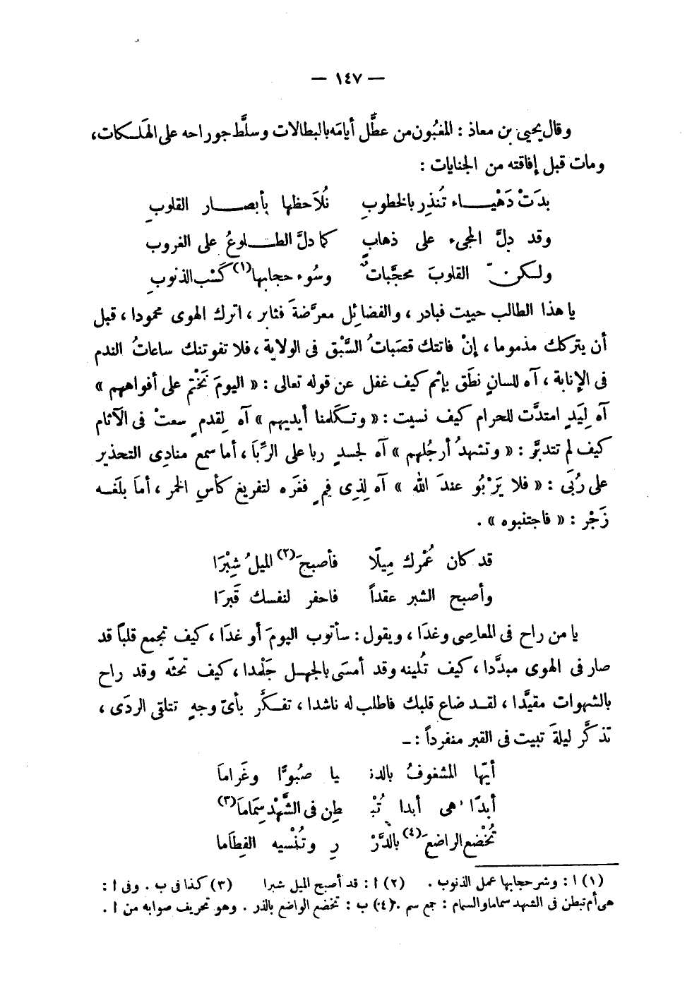 | | وقال يحيى بن معاذ : المغبون من عطل أيامه بالبطالات وسلط جوارحه على الهلكات , | ومات قبل إفاقته من الجنايات : | | ( بدت دهياء تنذر بالخطوب % نلاحظها بأبصار القلوب ) % | | ( وقد دل المجيء على ذهاب % كما دل الطلوع على الغروب ) % | | يا هذا الطالب حييت فبادر , والفضائل معرضة فثابر , اترك الهوى محموداً , قبل | أن يتركك مذموماً , إن فاتتك قصبات السبق في الولاية , فلا تفوتنك ساعات الندم | في الإنابة , آه للسان نطق بإثم كيف غفل عن قوله تعالى : ! 2 < اليوم نختم على أفواههم > 2 ! | آه ليد امتدت للحرام كيف نسيت : ! 2 < وتكلمنا أيديهم > 2 ! آه لقدم سعت في الآثام | كيف لم تتدبر : ! 2 < وتشهد أرجلهم > 2 ! آه لجسد ربا على الربا , أما سمع منادي التحذير | على ربى : ^ ( فلا يربو عند الله ) ^ آه لذي فم فغره لتفريغ كأس الخمر , أما بلغه | زجر : ! 2 < فاجتنبوه > 2 ! . | | ( قد كان عمرك ميلاً % فأصبح الميل شبرا ) % | | ( وأصبح الشبر عقداً % فاحفر لنفسك قبرا ) % | | يا من راح في المعاصي وغدا , ويقول : سأتوب اليوم أو غدا , كيف تجمع قلباً قد | صار في الهوى مبددا , كيف تلينه وقد أمسى بالجهل جلمدا , كيف تحثه وقد راح | بالشهوات مقيداً , لقد ضاع قلبك فاطلب له ناشدا , تفكر بأي وجه تتلقى اردى , | تذكر ليلة تبيت في القبر منفرداً : | | ( أيها المشغوف بالدنيا % صبوا وغراما ) % | | ( أبدا هي أبدا تبطن % في الشهد سماما ) % | | ( تخضع الراضع بالدرر % وتنسيه الفطاما ) % |