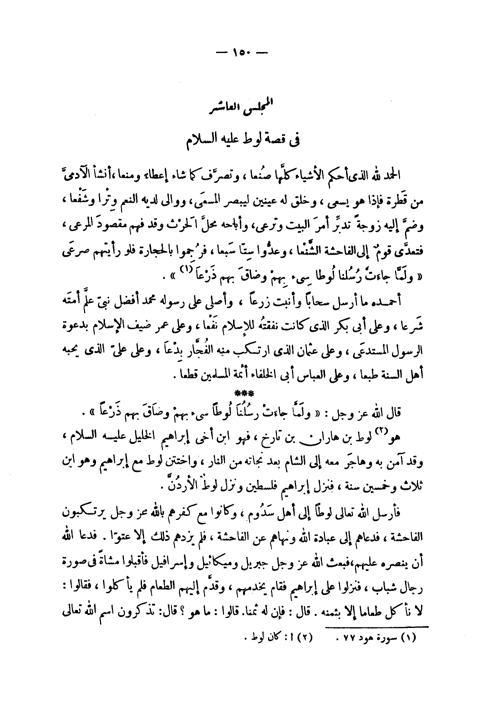 | المجلس العاشر | في قصة لوط عليه السلام | | الحمد لله الذي أحكم الأشياء كلها صنعا , وتصرف كما شاء إعطاء ومنعاً , أنشأ الآدمي | من قطرة فإذا هو يسعى , وخلق له عينين ليبصر المسعى , ووالى لديه النعم وترا وشفعاً , | وضم إاليه زوجة تدبر أمر البيت وترعى , وأباحه محل الحرث وقد فهم مقصود المرعى , | فتعدى قوم إلى الفاحشة الشنعا , وعدوا ستا سبعاً , فرجموا بالحجارة فلو رأيتهم صرعى | ^ ( ولما جاءت رسلنا لوطاً سيء بهم وضاق بهم ذرعاً ) ^ . | | أحمده ما أرسل سحاباً وأنبت زرعاً , وأصلي على رسوله محمد أفضل نبي علم أمته | شرعاً , وعلى أبي بكر الذي كانت نفقته للإسلام نفعاً وعلى عمر ضيف الإسلام بدعوة | الرسول المستدعي وعلى عثمان الذي ارتكب منه الفجار بدعا , وعلى علي الذي يحبه | أهل السنة طبعاً , وعلى العباس أبي الخلفاء أئمة المسلمين قطعاً . | | قال الله عز وجل : ^ ( ولما جاءت رسلنا لوطاً سيء بهم وضاق بهم ذرعاً ) ^ | | هو لوط بن هاران بن تارخ , هو ابن أخي إبراهيم الخليل عليه السلام , | وقد آمن به وهاجر معه إلى الشام بعد نجاته من النار , واختتن لوط مع إبراهيم وهو ابن | ثلاث وخمسين سنة , فنزل إبراهيم فلسطين ونزل لوط الأردن . | | فأرسل الله تعالى لوطاً إلى أهل سدوم , وكانوا مع كفرهم بالله عز وجل يرتكبون | الفاحشة فدعاهم إلى عبادة الله ونهاهم عن الفاحشة . لم يزدهم ذلك إلا عتواً . فدعا الله | أن ينصره عليهم , فبعث الله عز وجل جبريل وميكائيل وإسرافيل فأقبلوا مشاة في صورة | رجال شباب , فنزلوا على إبراهيم فقام يخدمهم , وقدم إليهم الطعام فلم يأكلوا , فقالوا : | لا نأكل طعاماً إلى بثمنه . قال : فإن له ثمناً . قالوا : ما هو ؟ قال : تذكرون اسم الله تعالى |