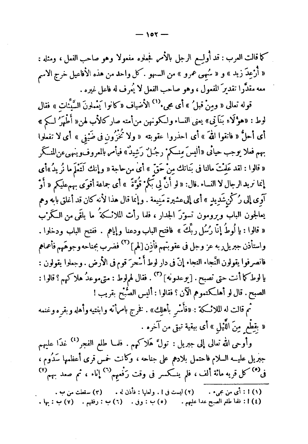 | كما قالت العرب : قد أولع الرجل بالأمر فجعلوه مفعولاً وهو صاحب الفعل , ومثله : | ' أرعد زيد ' و ' سهى عمرو ' من السهو . كل واحد من هذه الأفاعيل خرج الاسم | معه مقدراً تقدير المفعول , وهو صاحب الفعل لا يعرف له فاعل غيره . | | قوله تعالى : ! 2 < ومن قبل > 2 ! أي مجيء الأضياف ^ ( كانوا يعملون السيئات ) ^ فقال | لوط : ^ ( هؤلاء بناتي ) ^ يعني النساء ولكونهن من أمته صار كالأب لهن ^ ( أطهر لكم ) ^ | أي أحل ! 2 < فاتقوا الله > 2 ! أي احذروا عقوبته ^ ( ولا تخزون في ضيفي ) ^ أي لا تفعلوا | بهم فعلاً يوجب حيائي ^ ( أليس منكم رجل رشيد ) ^ فيأمر بالمعروف وينهى عن المنكر | ^ ( قالوا : لقد علمت ما لنا في بناتك من حق ) ^ أي من حاجة ^ ( وإنك لتعلم ما نريد ) ^ أي | إنما نريد الرجال لا النساء . قال : ^ ( لو أن لي بكم قوة ) ^ أي جماعة أقوى بهم عليكم ^ ( أو | آوي إلى ركن شديد ) ^ أي إلى عشيرة منيعة . وإنما قال هذا لأنه كان قد أغلق بابه وهم | يعالجون الباب ويرومون تسور الجدار فلما رأت الملائكة ما يلقى من الكرب | ^ ( قالوا : يا لوط إنا رسل ربك ) ^ فافتح الباب ودعنا وإياهم . ففتح الباب ودخلوا . | واستأذن جبريل ربه عز وجل في عقوبتهم فأذن [ لهم ] فضرب بجناحه وجوههم فأعماهم | فانصرفوا يقولون النجاء النجاء إن في دار لوط أسحر قوم في الأرض . وجعلوا يقولون : | يا لوط كما أنت حتى تصبح . [ يوعدونه ] . فقال لهم لوط : متى موعد هلاكهم ؟ قالوا : | لصبح . قال لو أهلكتموهم الآن ؟ فقالوا : أليس الصبح بقريب ! | | ثم قالت له الملائكة : ' فأسر بأهلك ' . فخرج بامرأته وابنتيه وأهله وبقره وغنمه | ^ ( بقطع من الليل ) ^ أي ببقية تبقى من آخره . | | وأوحى الله تعالى إلى جبريل : تول هلاكهم . فلما طلع الفجر غدا عليهم | جبريل عليه السلام فاحتمل بلادهم على جناحه , وكان خمس قرى أعظمها سدوم , | في كل قرية مائة ألف , فلم ينكسر في وقت رفعهم إناء , ثم صعد بهم |