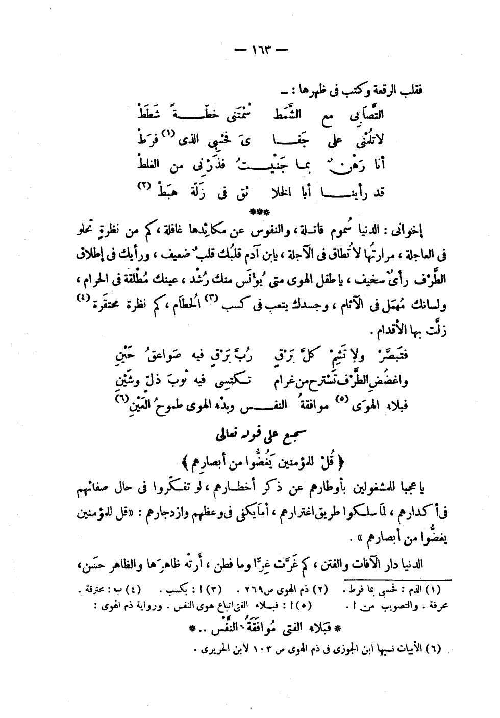 | | فقلب الرقعة وكتب في ظهرها : | | ( التصابي مع الشمط % سمتني خطة شطط ) % | | ( لا تلمني على جفاي % فحسبي الذي فرط ) % | | ( أنا رهن بما جنيت % فذرني من الغلط ) % | | ( قد رأينا أبا الخلائق % في زلة هبط ) % | | إخواني : الدنيا سموم قاتلة , والنفوس عن مكائدها غافلة , كم من نظرة تحلو | في العاجلة , مرارتها لا تطاق في الآجلة , يا بن آدم قلبك قلب ضعيف , ورأيك في إطلاق | الطرف رأي سخيف , يا طفل الهوى متى يؤنس منك رشد , عينك مطلقة في الحرام , | ولسانك مهمل في الآثام وجسدك يتعب في كسب الحطام , كم نظرة محتقرة | زلت بها الأقدام . | | ( فتبصر ولا تشم كل برق % رب برق فيه صواعق حين ) % | | ( واغضض الطرف تسترح من غرام % تكتسي فيه ثوب ذل وشين ) % | | ( فبلاء الهوى موافقة النفس % وبدء الهوى طموح العين ) % | سجع على قوله تعالى | ! 2 < قل للمؤمنين يغضوا من أبصارهم > 2 ! | يا عجباً للمشغولين بأوطارهم عن ذكر أخطارهم , لو تفكروا في حال صفائهم | في أكدارهم , لما سلكوا طريق اغترارهم , ما يكفي في وعظهم وازدجارهم : ! 2 < قل للمؤمنين يغضوا من أبصارهم > 2 ! . | | الدنيا دار الآفات والفتن , كم غرت غرا وما فطن , أرته ظاهرها والظاهر حسن , |