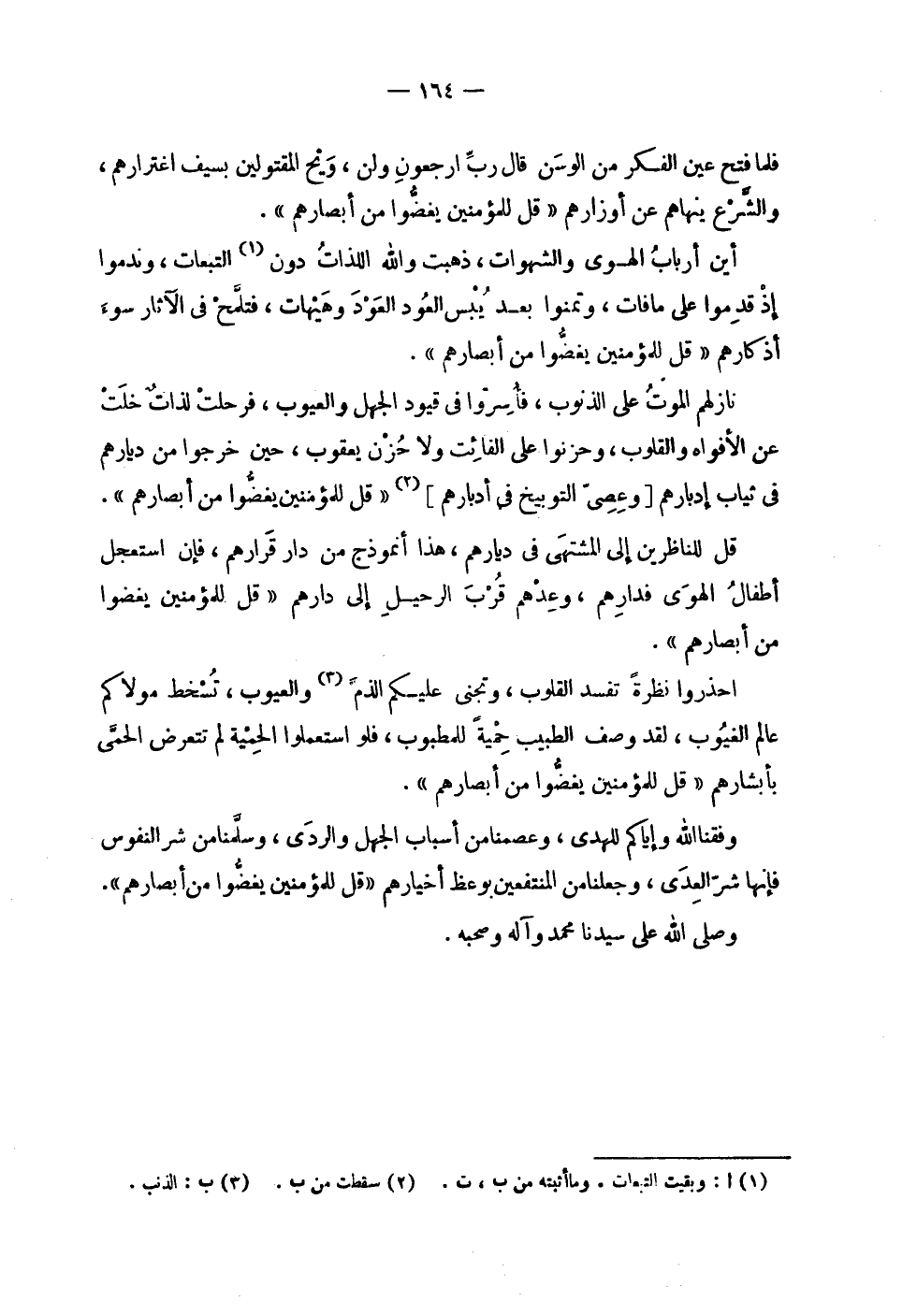| فلما فتح عين الفكر من الوسن قال رب ارجعون ولن , ويح المقتولين بسيف اغترارهم , | والشرع ينهاهم عن أوزارهم ! 2 < قل للمؤمنين يغضوا من أبصارهم > 2 ! . | | أين أرباب الهوى والشهوات , ذهبت والله اللذات دون التبعات , وندموا | إذ قدموا على ما فات وتمنوا بعد يبس العود العود وهيهات , فتلمح في الآثار سوء | أذكارهم ! 2 < قل للمؤمنين يغضوا من أبصارهم > 2 ! . | | نازلهم الموت على الذنوب , فأسروا في قيود الجهل والعيوب , فرحلت لذات خلت | عن الأفواه والقلوب , وحزنوا على الفائت ولا حزن يعقوب , حين خرجوا من ديارهم | في ثياب إدبارهم [ وعصى التوبيخ في أدبارهم ] ! 2 < قل للمؤمنين يغضوا من أبصارهم > 2 ! . | | قل للناظرين إلى المشتهى في ديارهم , هذا أنموذج من دار قرارهم , فإن استعجل | أطفال الهوى فدارهم , وعدهم قرب الرحيل إلى دارهم ! 2 < قل للمؤمنين يغضوا من أبصارهم > 2 ! . | | احذروا نظرة تفسد القلوب , وتجني عليكم الذم والعيوب , تسخط مولاكم | عالم الغيوب , لقد وصف الطبيب حمية للمطبوب , فلو استعملوا الحمية لم تتعرض الحمى | بأبشارهم ! 2 < قل للمؤمنين يغضوا من أبصارهم > 2 ! . | | وفقنا الله وإياكم للهدى , وعصمنا من أسباب الجهل والردى , وسلمنا من شر النفوس | فإنها شر العدى , وجعلنا من المنتفعين بوعظ أخيارهم ! 2 < قل للمؤمنين يغضوا من أبصارهم > 2 ! . | | وصلى الله على سيدنا محمد وآله وصحبه . |
