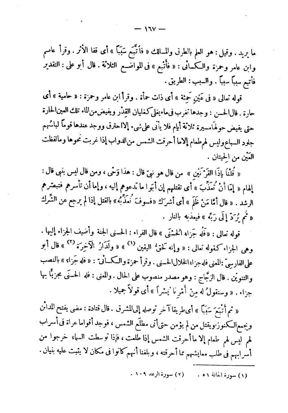 | ما يريد . وقيل : هو العلم بالطرق والمسالك ! 2 < فأتبع سببا > 2 ! أي قفا الأثر . وقرأ عاصم | وابن عامر وحمزة والكسائي : ! 2 < فاتبع > 2 ! في المواضع الثلاثة . قال أبو علي : التقدير | فأتبع سبباً سبباً . والسبب : الطريق . | | قوله تعالى : ! 2 < في عين حمئة > 2 ! أي ذات حمأة . وقرأ ابن عامر وحمزة : ! 2 < حامية > 2 ! أي | حارة . قال الحسن : وجدها تغرب في ماء يغلي كغليان القدر ويفيض من الماء تلك العين الحارة | حتى يفيض حولها مسيرة ثلاثة أيام فلا يأتي على شيء إلا احترق ووجد عندها قوماً لباسهم | جلود السباع وليس لهم طعام إلا ما أحرقت الشمس من الدواب إذا غربت نحوها وما لفظت | العين من الحيتان . | | ! 2 < قلنا يا ذا القرنين > 2 ! من قال هو نبي قال : هذا وحي , ومن قال ليس بنبي قال : | إلهام ! 2 < إما أن تعذب > 2 ! أي تقتلهم إن أبوا ما تدعوهم إليه , وإما أن تأسرهم فتبصرهم | الرشد . ! 2 < قال أما من ظلم > 2 ! أي أشرك ! 2 < فسوف نعذبه > 2 ! بالقتل إذا لم يرجع عن الشرك | ! 2 < ثم يرد إلى ربه > 2 ! فيعذبه بالنار . | | قوله تعالى : ! 2 < فله جزاء الحسنى > 2 ! قال الفراء : الحسنى الجنة وأضيف الجزاء إليها . | وهي الجزاء كقوله تعالى : ! 2 < وإنه لحق اليقين > 2 ! ! 2 < ولدار الآخرة > 2 ! قال أبو | علي الفارسي : المعنى فله جزاء الخلال الحسنى . وقرأ حمزة والكسائي : ! 2 < فله جزاء > 2 ! بالنصب | والتنوين . قال الزجاج : وهو مصدر منصوب على الحال . والمعنى : فله الحسنى مجزياً بها | جزاه , ! 2 < وسنقول له من أمرنا يسرا > 2 ! أي قولاً جميلاً . | | ! 2 < ثم أتبع سببا > 2 ! أي طريقاً آخر توصله إلى المشرق . قال قتادة : مضى يفتح المدائن | ويجمع الكنوز ويقتل من لم يؤمن حتى أتى مطلع الشمس , فوجد أقواماً عراة في أسراب | لهم ليس لهم طعام إلا ما أحرقت الشمس إذا طلعت فإذا توسطت السماء خرجوا من | أسرابهم في طلب معايشهم مما أحرقته , وبلغنا أنهم كانوا في مكان لا يثبت عليه بنيان . |