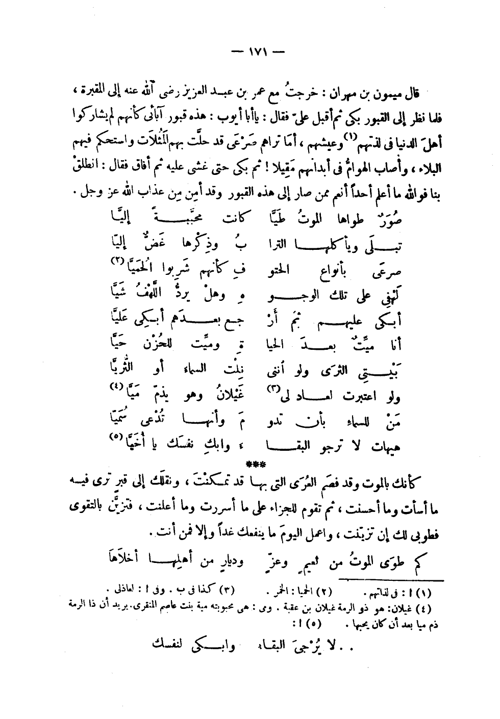 | | قال ميمون بن مهران : خرجت مع عمر بن عبد العزيز رضي الله عنه إلى المقبرة , | فلما نظر إلى القبور بكى ثم أقبل علي فقال : يا أبا أيوب : هذه قبور آبائي كأنهم لم يشاركوا | أهل الدنيا في لذتهم وعيشهم , أما تراهم صرعى قد حلت بهم المثلات واستحكم فيهم | البلاء , وأصاب الهوام في أبدانهم مقيلاً ! ثم بكى حتى غشي عليه ثم أفاق فقال : انطلق | بنا فوالله ما أعلم أحداً أنعم ممن صار إلى هذه القبور وقد أمن من عذاب الله عز وجل . | | ( صور طواها الموت طياً % كانت محببة إليا ) % | | ( تبلى ويأكلها التراب % وذكرها غض إليا ) % | | ( صرعى بأنواع الحتوف % كأنهم شربوا الحميا ) % | | ( لهفي على تلك الوجوه % وهل يرد اللهف شيا ) % | | ( أبكي عليهم ثم أرجع % بعدهم أبكي عليا ) % | | ( أنا ميت بعد الحياة % وميت للحزن حيا ) % | | ( بيتي الثرى ولو أنني % نلت السماء أو الثريا ) % | | ( ولو اعتبرت لعاد لي % غيلان وهو يذم ميا ) % | | ( من للسماء بأن تدوم % وأنها تدعى سميا ) % | | ( هيهات لا ترجو البقاء % وأبك نفسك يا أخيا ) % | | كأنك بالموت وقد فصم العرى التي بها قد تمكنت , ونقلك إلى قبر ترى فيه | ما أسأت وما أحسنت , ثم تقوم للجزاء على ما أسررت وما أعلنت , فتزين بالتقوى | فطوبى لك إن تزينت , واعمل اليوم ما ينفعك غداً وإلا فمن أنت . | | ( كم طوى الموت من نعيم وعز % وديار من أهلها أخلاها ) % |