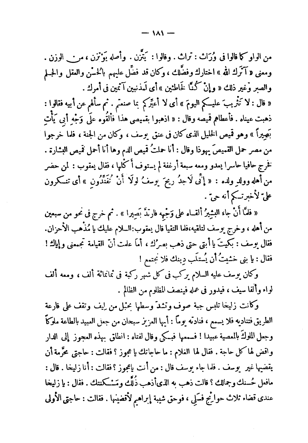 | من الواو كما قالوا في وراث : تراث . وقالوا : يتزن . وأصله يوتزن , من الوزن . | ومعنى ' آثرك الله ' اختارك وفضلك , وكان قد فُضِّل عليهم بالحسن والعقل والحلم | والصبر وغير ذلك ! 2 < وإن كنا لخاطئين > 2 ! أي لمذنبين آثمين في أمرك . | | ! 2 < قال لا تثريب عليكم اليوم > 2 ! أي لا أعيركم بما صنعتم . ثم سألهم عن أبيه فقالوا : | ذهبت عيناه . فأعطاهم قميصه وقال : ! 2 < اذهبوا بقميصي هذا فألقوه على وجه أبي يأت بصيرا > 2 ! وهو قميص الخليل الذي كان في عنق يوسف , وكان من الجنة , فلما خرجوا | من مصر حمل القميص يهوذا وقال : أنا حملت قميص الدم وها أنا أحمل قميص البشارة . | فخرج حافياً حاسراً يعدو ومعه سبعة أرغفة لم يستوف أكلها , فقال يعقوب لمن حضر | من أهله وولد ولده : ! 2 < إني لأجد ريح يوسف لولا أن تفندون > 2 ! أي تنكرون | علي لأخبرتكم أنه حي . | | ! 2 < فلما أن جاء البشير ألقاه على وجهه فارتد بصيرا > 2 ! . ثم خرج في نحو من سبعين | من أهله , وخرج يوسف لتلقيه , فلما التقيا قال يعقوب : السلام عليك يا مذهب الأحزان . | فقال يوسف : بكيت يا أبتي حتى ذهب بصرك , أما علمت أن القيامة تجمعني وإياك ! | فقال : يا بني خشيت أن يستلب دينك فلا نجتمع ! | | وكان يوسف عليه السلام يركب في كل شهر ركبة في ثمانمائة ألف , ومعه ألف | لواء وألفا سيف , فيدور في عمله فينصف المظلوم من الظالم . | | وكانت زليخا تلبس جبة صوف وتشد وسطها بحبل من ليف وتقف على قارعة | الطريق فتناديه فلا يسمع , فنادته يوماً : أيها العزيز سبحان من جعل العبيد بالطاعة ملوكاً | وجعل الملوك بالمعصية عبيداً ! فسمعها فبكى وقال لفتاه : انطلق بهذه العجوز إلى الدار | واقض لها كل حاجة . فقال لها الغلام : ما حاجاتك يا عجوز ؟ فقالت : حاجتي محرمة أن | يقضيها غير يوسف . فلما جاء يوسف قال : من أنت يا عجوز ؟ فقالت : أنا زليخا . قال : | ما فعل حسنك وجمالك ؟ قالت ذهب به الذي أذهب ذلك ومسكنتك . فقال : يا زليخا | عندي قضاء ثلاث حوائج فسلي , فوحق شيبة إبراهيم لأقضينها . فقالت : حاجتي الأولى |