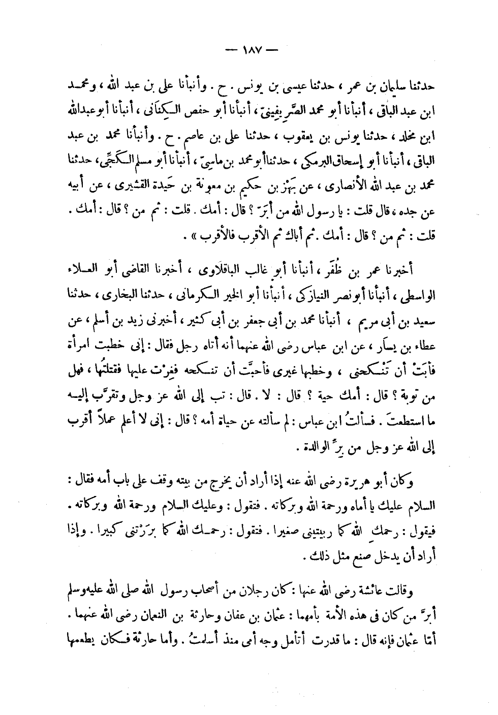 | حدثنا سليمان بن عمر , حدثنا عيسى بن يونس . ح . وأنبأنا علي بن عبد الله ، ومحمد | ابن عبد الباقي , أنبأنا أبو محمد الصريفيني , أنبأنا أبو حفص الكناني , أنبأنا أبو عبد الله | ابن مخلد , حدثنا يونس بن يعقوب , حدثنا علي بن عاصم . ح . وأنبأنا محمد بن عبد | الباقي , أنبأنا أبو إسحاق البرمكي , حدثنا أبو محمد بن ماسي , أنبأنا أبو مسلم الكجي , حدثنا | محمد بن عبد الله الأنصاري , عن بهز بن حكيم بن معونة بن حيدة القشيري , عن أبيه | عن جده , قال قلت : يا رسول الله من أبر ؟ قال : أمك . قلت : ثم من ؟ قال : أمك . | قلت : ثم من ؟ قال : أمك . ثم أباك ثم الأقرب فالأقرب ' . | | أخبرنا عمر بن ظفر , أنبأنا أبو غالب الباقلاوي , أخبرنا القاضي أبو العلاء | الواسطي , أنبأنا أبو نصر النيازكي , أنبأنا أبو الخير الكرماني , حدثنا البخاري , حدثنا | سعيد بن أبي مريم , أنبأنا محمد بن أبي جعفر بن أبي كثير , أخبرني زيد بن أسلم , عن | عطاء بن يسار , عن ابن عباس رضي الله عنهما أنه أتاه رجل فقال : إني خطبت امرأة | فأبت أن تنكحني , وخطبها غيري فأحبت أن تنكحه فغرت عليها فقتلتها , فهل | من توبة ؟ قال : أمك حية ؟ قال : لا . قال : تب إلى الله عز وجل وتقرب إليه | ما استطعت . فسألت ابن عباس : لم سألته عن حياة أمه ؟ قال : إني لا أعلم عملاً أقرب | إلى الله عز وجل من بر الوالدة . | | وكان أبو هريرة رضي الله عنه إذا أراد أن يخرج من بيته وقف على باب أمه فقال : | السلام عليك يا أماه ورحمة الله وبركاته . فتقول : وعليك السلام ورحمة الله وبركاته . | فيقول : رحمك الله كما ربيتيني صغيراً . فتقول : رحمك الله كما بررتني كبيراً . وإذا | أراد أن يدخل صنع مثل ذلك . | | وقالت عائشة رضي الله عنها : كان رجلان من أصحاب رسول الله صلى الله عليه وسلم | أبر من كان في هذه الأمة بأمهما : عثمان بن عفان وحارثة بن النعمان رضي الله عنهما . | أما عثمان فإنه قال : ما قدرت أتأمل وجه أمي منذ أسلمت . وأما حارثة فكان يطعمها |