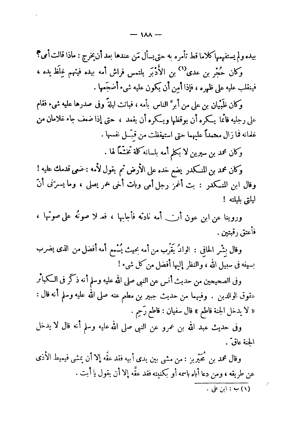 | بيده ولم يستفهمها كلاماً قط تأمره به حتى يسأل من عندها بعد أن يخرج : ماذا قالت أمي ؟ | | وكان حجر بن عدي بن الأدبر يلتمس فراش أمه بيده فيتهم غلظ يده , | فينقلب عليه على ظهره , فإذا أمن أن يكون عليه شيء أضجعها . | | وكان ظبيان بن علي من أبر الناس بأمه , فباتت ليلة وفي صدرها عليه شيء فقام | على رجليه قائماً يكره أن يوقظها ويكره أن يقعد , حتى إذا ضعف جاء غلامان من | غلمانه فما زال معتمداً عليهما حتى استيقظت من قبل نفسها . | | وكان محمد بن سيرين لا يكلم أمه بلسانه كلمة تخشعاً لها . | | وكان محمد بن المنكدر يضع خده على الأرض ثم يقول لأمه : ضعي قدمك عليه ! | وقال ابن المنكدر : بت أغمز رجل أمي وبات أخي عمر يصلي , وما يسرني أن | ليلتي بليلته ! | | وروينا عن ابن عون أن أمه نادته فأجابها , فعلا صوته على صوتها | فأعتق رقبتين . | | وقال بشر الحافي : الولد يقرب من أمه بحيث يسمع أمه أفضل من الذي يضرب | بسيفه في سبيل الله , والنظر إليها أفضل من كل شيء ! | | وفي الصحيحين من حديث أنس عن النبي صلى الله عليه وسلم أنه ذكر في الكبائر | عقوق الوالدين . وفيهما من حديث جبير بن مطعم عنه صلى الله عليه وسلم أنه قال : | ' لا يدخل الجنة قاطع ' قال سفيان : قاطع رحم . | | وفي حديث عبد الله بن عمرو عن النبي صلى الله عليه وسلم أنه قال لا يدخل | الجنة عاق . | | وقال محمد بن محيريز : من مشى بين يدي أبيه فقد عقه إلا أن يمشي فيميط الأذى | عن طريقه , ومن دعا أباه باسمه أبو بكنيته فقد عقه إلا أن يقول يا أبت . |