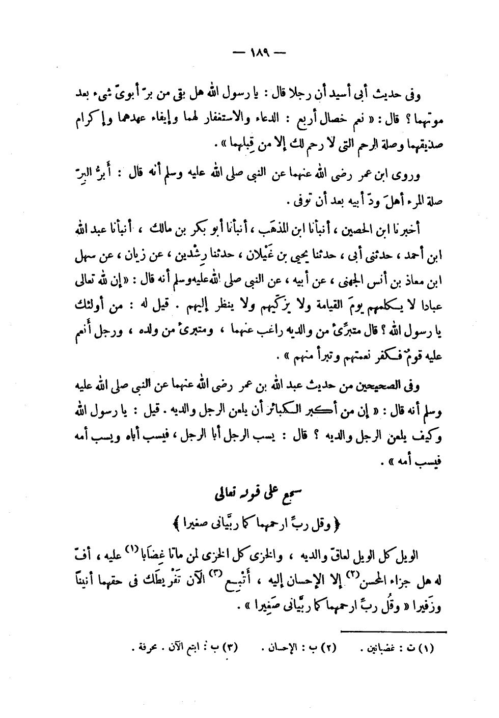 | | وفي حديث أبي أسيد أن رجلاً قال : يا رسول الله هل بقي من بر أبوي شيء بعد | موتهما ؟ قال : ' نعم خصال أربع : الدعاء والإستغفار لهما وإيفاء عهدهما وإكرام | صديقهما وصلة الرحم التي لا رحم لك إلا من قبلهما ' . | | وروى ابن عمر رضي الله عنهما عن النبي صلى الله عليه وسلم قال : ' أبر البر | صلة المرء أهل ود أبيه بعد أن توفي . | | أخبرنا ابن الحصين , أنبأنا ابن المذهب , أنبأنا أبو بكر بن مالك , أنبأنا عبد الله | ابن أحمد , حدثني أبي , حدثنا يحيى بن غيلان , حدثنا رشدين , عن زيان , عن سهل | ابن معاذ بن أنس الجهني , عن أبيه , عن النبي صلى الله عليه وسلم أنه قال : ' إن الله تعالى | عبادا لا يكلمهم يوم القيامة ولا يزكيهم ولا ينظر إليهم . قيل له : من أولئك | يا رسول الله ؟ قال متبرئ من والديه راغب عنهما , ومتبرئ من ولده , ورجل أنعم | عليه قوم فكفر نعمتهم وتبرأ منهم ' . | | وفي الصحيحين من حديث عبد الله بن عمر رضي الله عنهما عن النبي صلى الله عليه وسلم | أنه قال : ' إن من أكبر الكبائر أن يلعن الرجل والديه . قيل : يا رسول الله | وكيف يلعن الرجل والديه ؟ قال : يسب الرجل أبا الرجل , فيسب أباه ويسب أمه | فيسب أمه ' . | سجع على قوله تعالى | ! 2 < وقل رب ارحمهما كما ربياني صغيرا > 2 ! | | الويل كل الويل لعاق والديه , والخزي كل الخزي لمن ماتا غضابا عليه , أف | له هل جزاء المحسن إلا الإحسان إليه , أتبع الآن تفريطك في حقهما أنيناً | وزفيراً ! 2 < وقل رب ارحمهما كما ربياني صغيرا > 2 ! . |