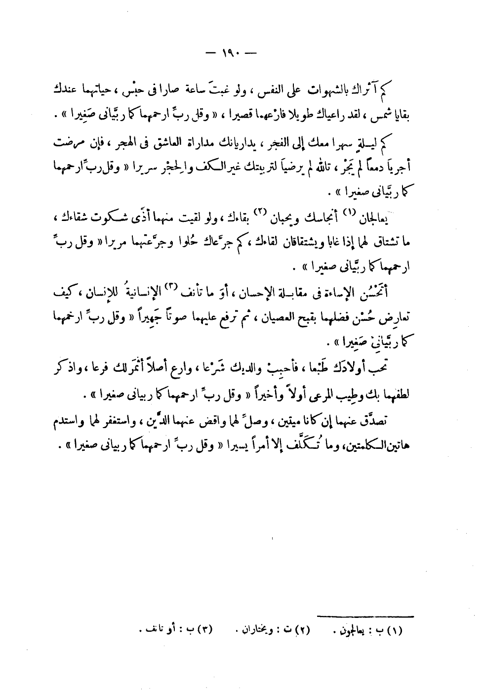 | | كم آثرك بالشهوات على النفس , ولو غبت ساعة صارا في حبس , حياتهما عندك | بقايا شمس , لقد راعياك طويلاً فارعهما قصيراً , ! 2 < وقل رب ارحمهما كما ربياني صغيرا > 2 ! . | | كم ليلة سهرا معك إلى الفجر , يداريانك مداراة العاشق في الهجر , فإن مرضت | أجريا دمعاً لم يجر , تالله لم يرضيا لتربيتك غير الكف والحجر سريراً ! 2 < وقل رب ارحمهما كما ربياني صغيرا > 2 ! . | | يعالجان أنجاسك ويحبان بقاءك , ولو لقيت منهما أذى شكوت شقاءك , | ما تشتاق لهما إذا غابا ويشتقاقان لقاءك , كم جرعاك حلوا وجرعتهما مريراً ! 2 < وقل رب ارحمهما كما ربياني صغيرا > 2 ! . | | أتحسن الإساءة في مقابلة الإحسان , أو ما تأنف الإنسانية للإنسان , كيف | تعارض حسن فضلهما بقبح العصيان , ثم ترفع عليهما صوتاً جهيراً , ! 2 < وقل رب ارحمهما كما ربياني صغيرا > 2 ! . | | تحب أولادك طبعاً , فأحبب والديك شرعاً , وارع أصلاً أثمر لك فرعاً , واذكر | لطفهما بك وطيب المرعى أولاً وأخيراً ! 2 < وقل رب ارحمهما كما ربياني صغيرا > 2 ! . | | تصدق عنهما إن كانا ميتين , وصل لهما واقض عنهما الدين , واستغفر لهما واستدم | هاتين الكلمتين , وما تكلف إلا أمراً يسيراً ! 2 < وقل رب ارحمهما كما ربياني صغيرا > 2 ! . |