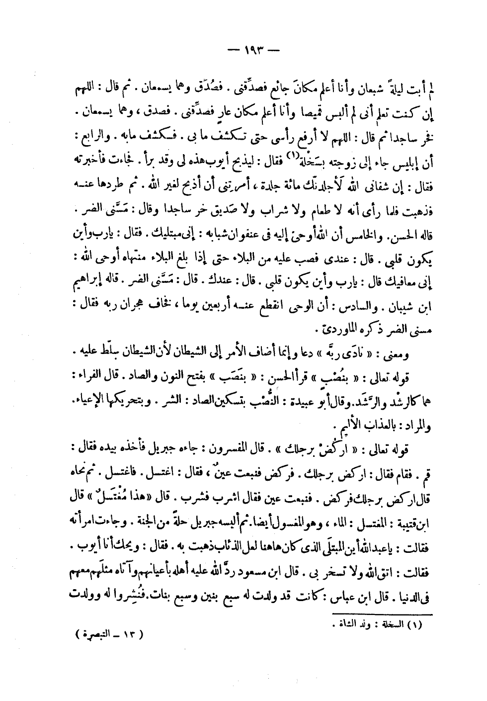 | لم أبت ليلة شبعان وأنا أعلم مكان جائع فصدقني . فصدق وهما يسمعان . ثم قال : اللهم | إن كنت تعلم أني لم ألبس قميصاً وأنا أعلم مكان عار فصدقني . فصدق وهما يسمعان , | فخر ساجداً ثم قال : اللهم لا أرفع رأسي حتى تكشف ما بي . فكشف ما به . والرابع : | أن إبليس جاء إلى زوجته بسخلة فقال : ليذبح أيوب هذه لي وقد برأ . فجاءت فأخبرته | فقال : إن شفاني الله لأجلدنك مائة جلدة , أمرتني أن أذبح لغير الله . ثم طردها عنه | فذهبت فلما رأى أنه لا طعام ولا شراب ولا صديق خر ساجداً وقال : مسني الضر . | قاله الحسن . والخامس : أن الله أوحى إليه في عنفوان شبابه : إني مبتليك . فقال : يا رب وأين | يكون قلبي . قال : عندي فصب عليه من البلاء حتى إذا بلغ البلاء منتهاه أوحى الله : | إني معافيك قال : يا رب وأين يكون قلبي . قال : عندك . قال مسني الضر . قاله إبراهيم | ابن شيبان . والسادس : أن الوحي انقطع عنه أربعين يوماً , فخاف هجران ربه فقال : | مسني الضر ذكره الماوردي . | | ومعنى : ! 2 < نادى ربه > 2 ! دعا وإنما أضاف الأمر إلى الشيطان لأن الشيطان سلط عليه . | | قوله تعالى : ! 2 < بنصب > 2 ! قرأ الحسن : ! 2 < بنصب > 2 ! بفتح النون والصاد . قال الفراء : | هما كالرشد والرشد . وقال أبو عبيدة : النصب بتسكين الصاد : الشر . وبتحريكها الإعياء . | والمراد : بالعذاب الأليم . | | قوله تعالى : ! 2 < اركض برجلك > 2 ! . قال المفسرون : جاءه جبريل فأخذه بيده فقال : | قم : فقام فقال : اركض برجلك . فركض فنبعث عين , فقال : اغتسل . فاغتسل . ثم نحاه | قال اركض برجلك فركض . فنبعث عين فقال اشرب فشرب . قال ! 2 < هذا مغتسل > 2 ! قال | ابن قتيبة : المغتسل : الماء , وهو المغسول أيضاً . ثم ألبسه جبريل حلة من الجنة . وجاءت امرأته | فقالت : يا عبد الله أين المبتلى الذي كان ها هنا لعل الذئاب ذهبت به . فقال : ويحك أنا أيوب . | فقالت : اتق الله ولا تسخر بي . قال ابن مسعود رد الله عليه أهله بأعيانهم وآتاه مثلهم معهم | في الدنيا . قال ابن عباس : كانت قد ولدت له سبع بنين وسبع بنات . فنشروا له وولدت |