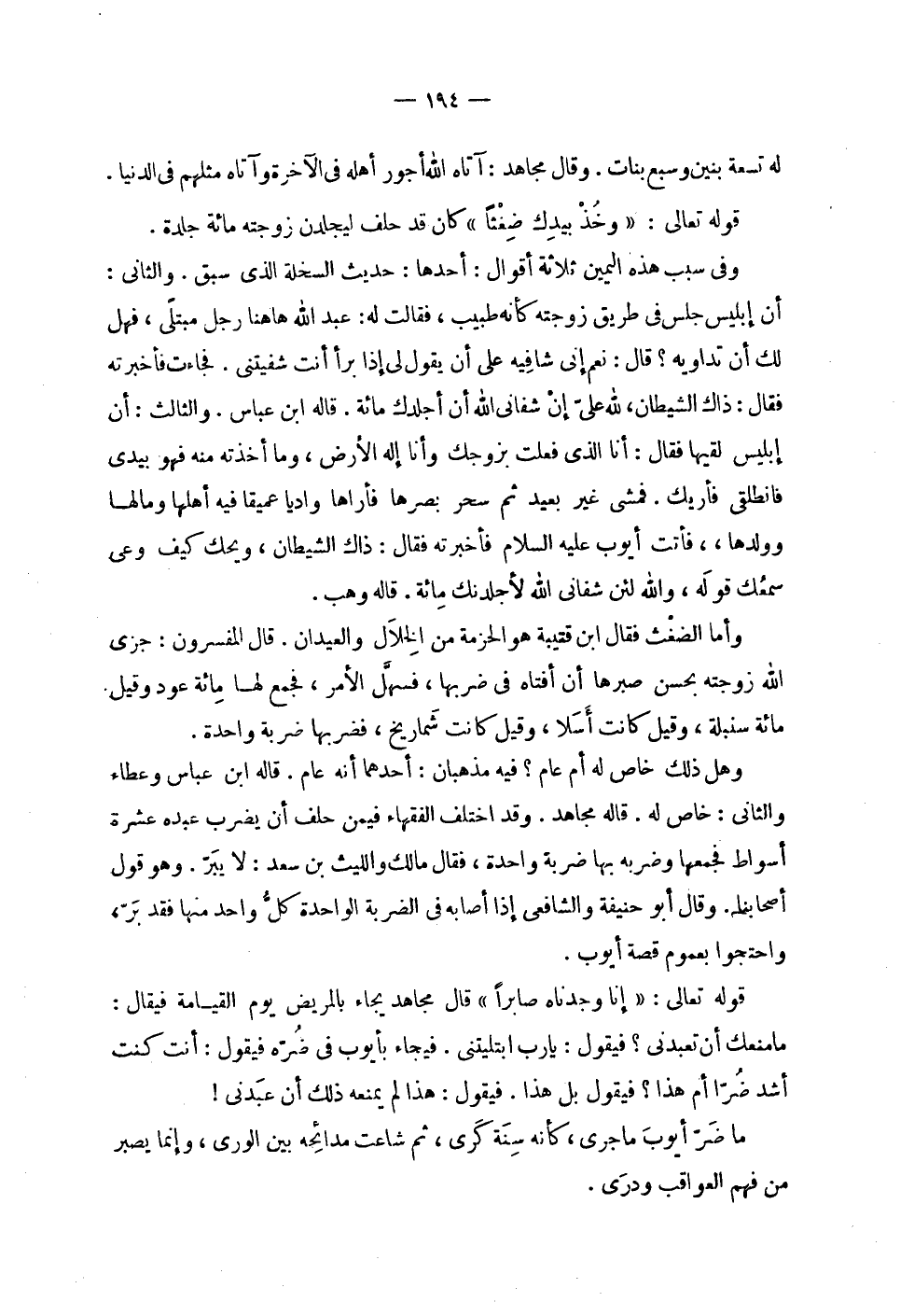 | له تسعة بنين وسبع بنات . وقال مجاهد : آتاه الله أجور أهله في الآخرة وآتاه مثلهم في الدنيا . | | قوله تعالى : ! 2 < وخذ بيدك ضغثا > 2 ! كان قد حلف ليجلدن زوجته مائة جلدة . | | وفي سبب هذه اليمين ثلاثة أقوال : أحدها : حديث السخلة الذي سبق . والثاني : | أن إبليس جلس في طريق زوجته كأنه طبيب , فقالت له : عبد الله هاهنا رجل مبتلى , فهل | لك أن تداويه ؟ قال : نعم إني شافيه على أن يقول لي إذا برأ أنت شفيتني . جاءت فأخبرته | فقال : ذاك الشيطان , لله علي إن شفاني الله أن أجلدك مائة . قاله ابن عباس . والثالث : أن | إبليس لقيها فقال : أنا الذي فعلت بزوجك وأنا إله الأرض , وما أخذته منه فهو بيدي | فانطلقي فأريك . فمشى غير بعيد ثم سحر بصرها فأراها وادياً عميقاً فيه أهلها ومالها | وولدها , فأتت أيوب عليه السلام فأخبرته فقال : ذاك الشيطان , ويحك كيف وعى | سمعك قوله , والله لئن شفاني الله لأجلدنك مائة جلدة . قاله وهب . | | وأما الضغث فقال ابن قتيبة هو الحزمة من الخلال والعيدان . قال المفسرون : جزى | الله زوجته بحسن صبرها . أن أفتاه في ضربها , فسهل الأمر , فجمع لها مائة عود وقيل | مائة سنبلة , وقيل كانت أسلا , وقيل كانت شماريخ , فضربها ضربة واحدة . | | وهل ذلك خاص له أم عام ؟ فيه مذهبان : أحدهما أنه عام . قاله ابن عباس وعطاء . | والثاني : خاص له . قاله مجاهد . وقد اختلف الفقهاء فيمن حلف أن يضرب عبده عشرة | أسواط فجمعها وضربه بها ضربة واحدة . فقال مالك والليث بن سعد : لا يبر . وهو قول | أصحابنا . وقال أبو حنيفة والشافعي إذا أصابه في الضربة الواحدة كل واحد منها فقد بر , | واحتجوا بعموم قصة أيوب . | | قوله تعالى : ! 2 < إنا وجدناه صابرا > 2 ! قال مجاهد يجاء بالمريض يوم القيامة فيقال : | ما منعك أن تعبدني ؟ فيقول : يا رب ابتليتني . فيجاء بأيوب في ضره فيقول : أنت كنت | أشد ضراً أم هذا ؟ فيقول بل هذا . فيقول : هذا لم يمنعه ذلك أن عبدني ! | | ما ضر أيوب ما جرى , كأنه سنة كرى , ثم شاعت مدائحه بين الورى , وإنما يصير | من فهم العواقب ودرى . |