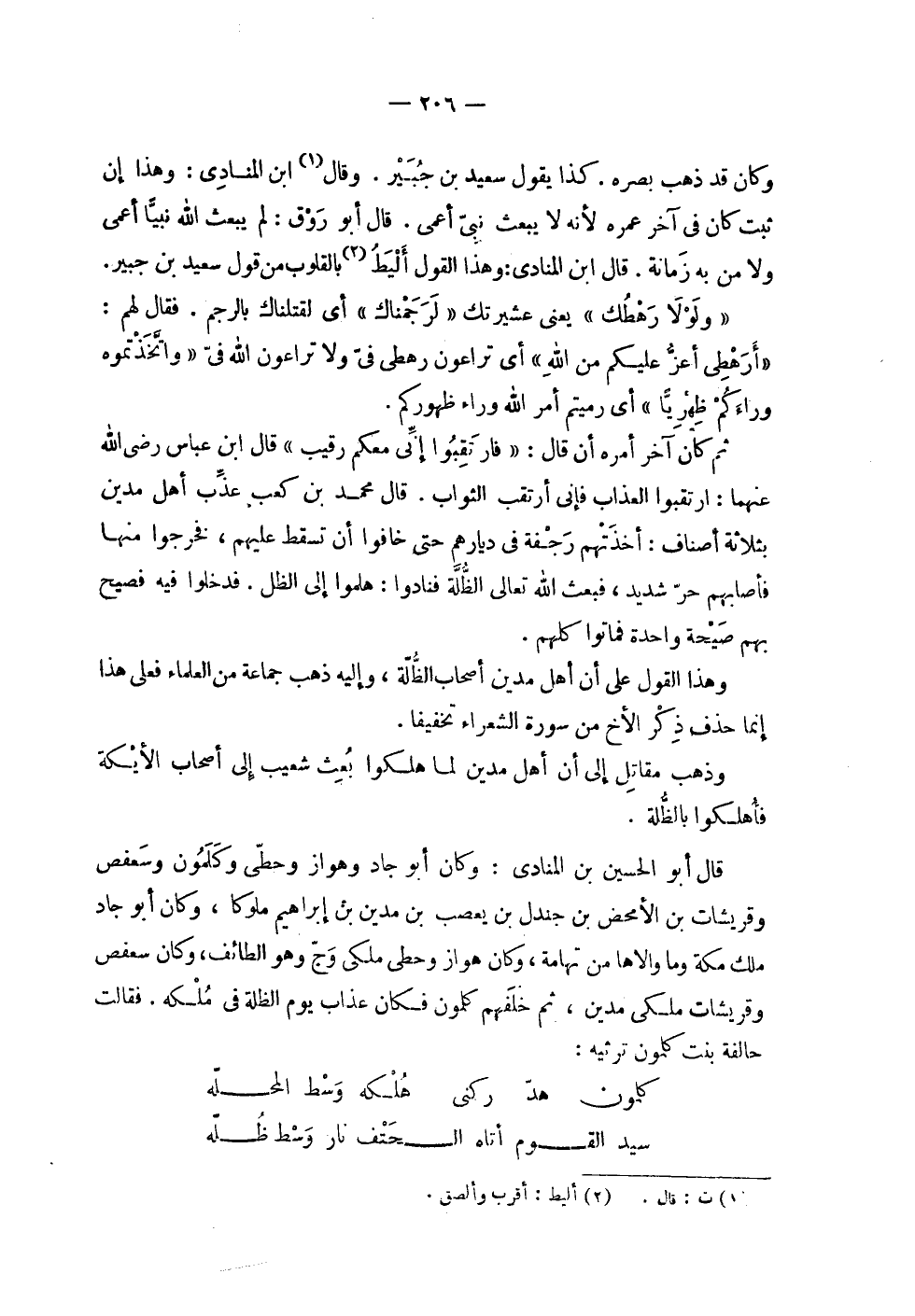 | وكان قد ذهب بصره . كذا يقول سعيد بن جبير . وقال ابن المنادي : وهذا إن | ثبت كان في آخر عمره لأنه لا يبعث نبي أعمى . قال أبو روق : لم يبعث الله نبياً أعمى | ولا من به زمانة . قال ابن المنادي : وهذا القول أليط بالقلوب من قول سعيد بن جبير . | | ^ ( ولولا رهطك ) ^ يعني عشيرتك ^ ( لرجمناك ) ^ أي لقتلناك بالرجم . فقال لهم : | ^ ( أرهطي أعز عليكم من الله ) ^ أي تراعون رهطي في ولا تراعون الله في ^ ( واتخذتموه | وراءكم ظهريا ) ^ أي رميتم أمر الله وراء ظهوركم . | | ثم كان آخر أمره أن قال : ^ ( فارتقبوا إني معكم رقيب ) ^ قال ابن عباس رضي الله | عنهما : ارتقبوا العذاب فإني أرتقب الثواب . قال محمد بن كعب عذب أهل مدين | بثلاثة أصناف : أخذتهم رجفة في ديارهم حتى خافوا أن تسقط عليهم , فخرجوا منها | فأصابهم حر شديد , فبعث الله تعالى الظلة فنادوا : هلموا إلى الظل . فدخلوا فيه فصيح | بهم صيحة واحدة فماتوا كلهم . | | وهذا القول على أن أهل مدين أصحاب الظلة , وإليه ذهب جماعة من العلماء فعلى هذا | إنما خذف ذكر الأخ من سورة الشعراء تخفيفاً . | | وذهب مقاتل إلى أن أهل مدين لما هلكوا بعث شعيب إلى أصحاب الأيكة | فأهلكوا بالظلة . | | قال أبو الحسين بن المنادى : وكان أبو جاد وهواز وحطى وكلمون وسعفص | وقريشات بن الامحض بن جندل بن يعصب بن مدين بن إبراهيم ملوكاً , وكان أبو جاد | ملك مكة وما والاها من تهامة , وكان هواز وحطى ملكي وج وهو الطائف , وكان سعفص | وقريشات ملكي مدين , ثم خلفهم كلمون فكان عذاب يوم الظلة في ملكه . فقالت | حالفة بنت كلمون ترثيه : | | ( كلمون هد ركني % هلكه وسط المحله ) % | | ( سيد القوم أتاه الحتف نار وسط ظله % ) % |