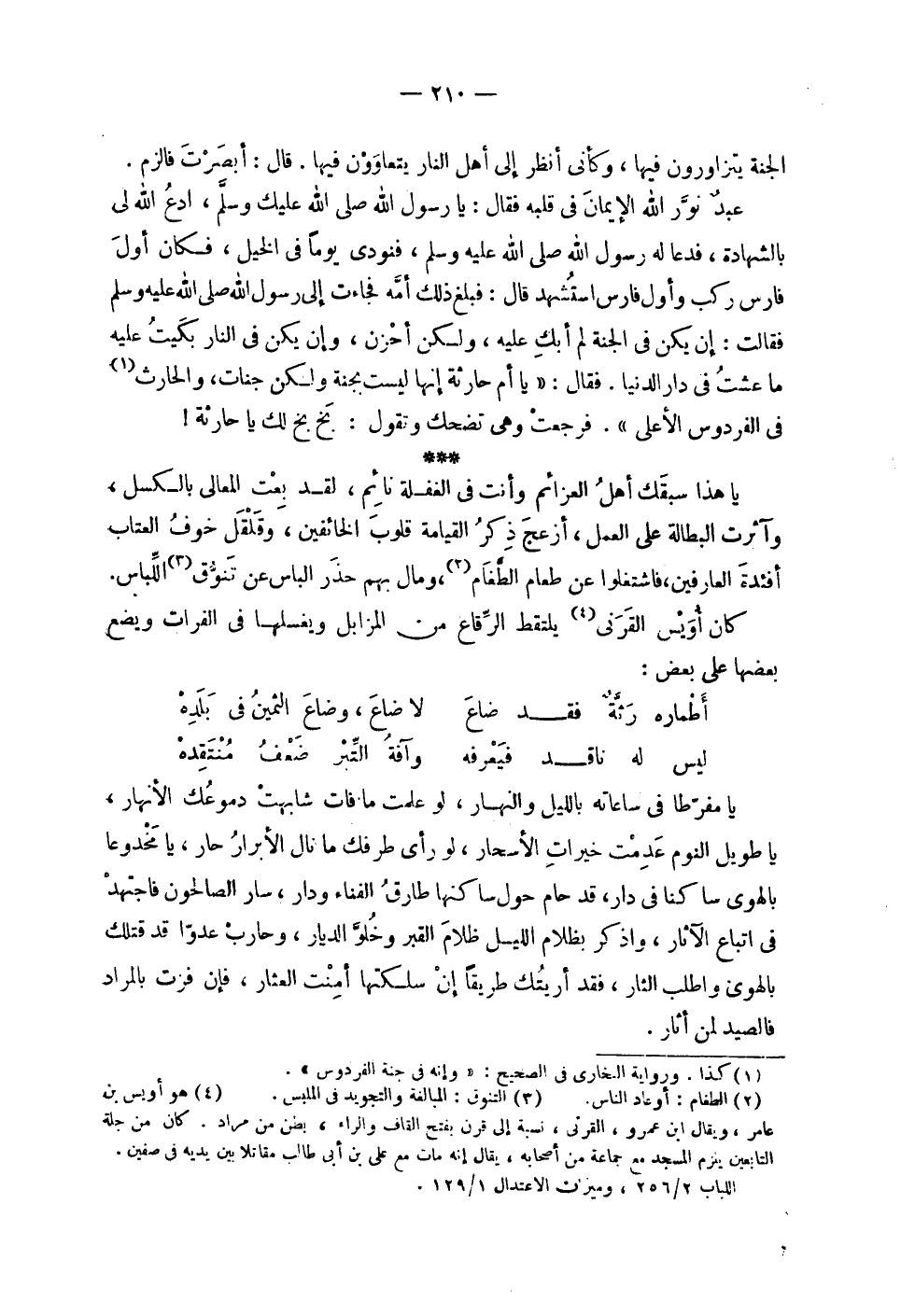 | الجنة يتزاورون فيها , وكأني أنظر إلى أهل النار يتعاوون فيها . قال : أبصرت فالزم . | | عبد نور الله الإيمان في قلبه فقال : يا رسول الله صلى الله عليه وسلم , ادع الله لي | بالشهادة , فدعا له رسول الله صلى الله عليه وسلم , فنودي يوماً في الخيل , فكان أول | فارس ركب وأول فارس استشهد قال : فبلغ ذلك أمه فجاءت إلى رسول الله صلى الله عليه وسلم | فقالت : إن يكن في الجنة لم أبك عليه , ولكن أحزن , وإن يكن في النار بكيت عليه | ما عشت في دار الدنيا . فقال : ' يا أم حارثة إنها ليست بجنة ولكن جنات , والحارث | في الفردوس الأعلى ' . فرجعت وهي تضحك وتقول : بخ بخ لك يا حارثة ! | | يا هذا سبقك أهل العزائم وأنت في الغفلة نائم , لقد بعث المعالي بالكسل , | وآثرت البطالة على العمل , أزعج ذكر القيامة قلوب الخائفين , وقلقل خوف العتاب | أفئدة العارفين , فاشتغلوا عن طعام الطغام , ومال بهم حذر الباس عن تنوق اللباس . | | كان أويس القرني يلتقط الرقاع من المزابل ويغسلها في الفرات ويضع | بعضها على بعض : | | ( أطماره رثة فقد ضاع % لا ضاع , وضاع الثمين في بلده ) % | | ( ليس له ناقد فيعرفه % وآفة التبر ضعف منتقده ) % | | يا مفرطاً في ساعاته بالليل والنهار , لو علمت ما فات شابهت دموعك الأنهار , | يا طويل النوم عدمت خيرات الأسحار , لو رأى طرفك ما نال الأبرار حار , يا مخدوعاً | بالهوى ساكناً في دار , قد حام حول ساكنها طارق الفناء ودار , سار الصالحون فاجتهد | في اتباع الآثار , واذكر بظلام لليل ظلام القبر وخلو الديار , وحارب عدواً قد قتلك | بالهوى واطلب الثار , فقد أريتك طريقاً إن سلكتها أمنت العثار , فإن فزت بالمراد | فالصيد لمن أثار . |