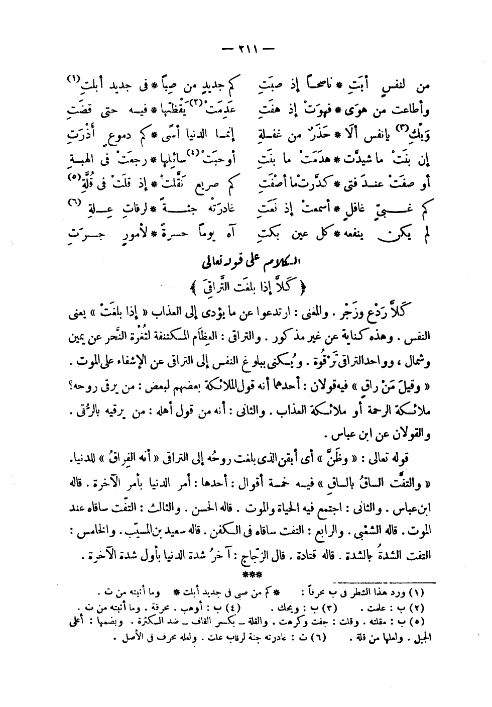 | | ( من لنفس أبت ناصحاً إذ صبت % كم جديد من صبا في جديد أبلت ) % | | ( وأطاعت من هوى فهوت إذ هفت % عدمت يقظتها فيه حتى قضت ) % | | ( ويك يا نفس ألا حذر من غفلة % إنما الدنيا أسى كم دموع أذرت ) % | | ( إن بنت ما شيدت هدمت ما بنت % أوحبت سائلها رجعت في الهبة ) % | | ( أو صفت عند فتى كدرت ما أصفت % كم صريع نقلت إذ قلت في قلة ) % | | ( كم غبي غافل أسمعت إذ نعت % غادرته جثة لرفات علة ) % | | ( لم يكن ينفعه كل عين بكت % آه يوماً حسرة لأمور جرت ) % | الكلام على قوله تعالى | ! 2 < كلا إذا بلغت التراقي > 2 ! | كلا ردع وزجر . والمعنى : ارتدعوا عن ما يؤدي إلى العذاب ! 2 < إذا بلغت > 2 ! يعني | النفس . وهذه كناية عن غير مذكور . والتراقي : العظام المكتنفة لثغرة النحر عن يمين | وشمال , وواحد التراقي ترقوة . ويكنى ببلوغ النفس إلى التراقي عن الإشفاء على الموت . | ! 2 < وقيل من راق > 2 ! فيه قولان : أحدهما أنه قول الملائكة بعضهم لبعض : من يرقى روحه ؟ | ملائكة الرحمة أو ملائكة العذاب . والثاني : أنه من قول أهله : من يرقيه بالرقي . | والقولان عن ابن عباس . | | قوله تعالى : ! 2 < وظن > 2 ! أي أيقن الذي بلغت روحه إلى التراقي ! 2 < أنه الفراق > 2 ! للدنيا . | ! 2 < والتفت الساق بالساق > 2 ! فيه خمسة أقوال : أحدها : أمر الدنيا بأمر الآخرة . قاله | ابن عباس . والثاني : اجتمع فيه الحياة والموت . قاله الحسن . والثالث : التفت ساقاه عند | الموت . قاله الشعبي . والرابع : التفت ساقاه في الكفن . قاله سعيد بن المسيب . والخامس : | التفت الشدة بالشدة . قاله قتادة . قال الزجاج : آخر شدة الدنيا بأول شدة الآخرة . |
