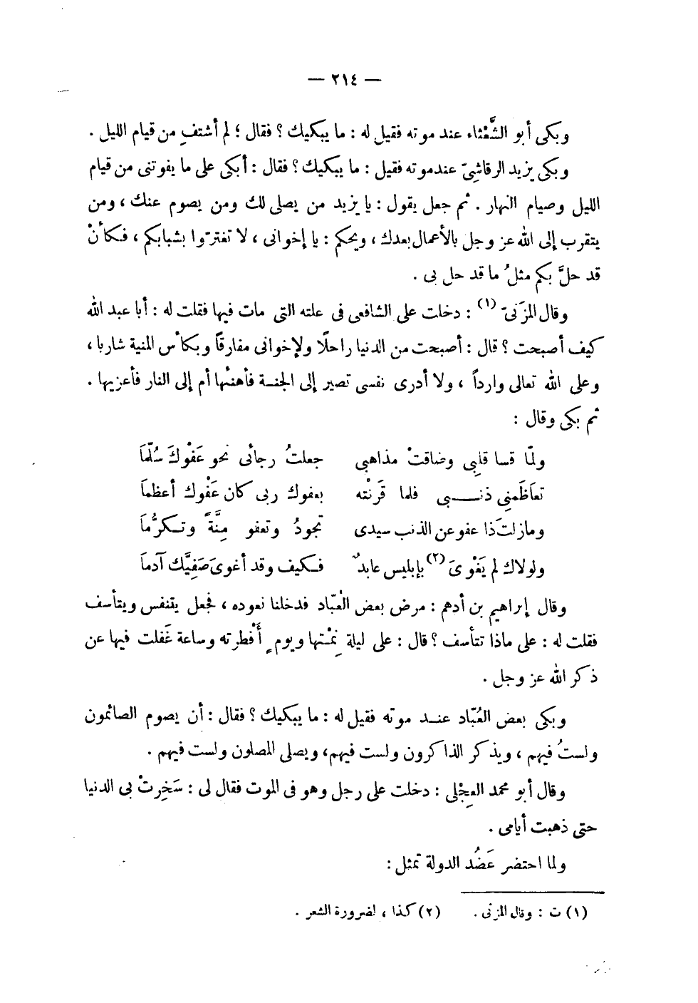 | | وبكى أبو الشعثاء عند موته فقيل له : ما يبكيك ؟ فقال : لم أشتف من قيام الليل . | | وبكى يزيد الرقاشي عند موته فقيل : ما يبكيك ؟ فقال : أبكي على ما يفوتني من قيام | الليل وصيام النهار . ثم جعل يقول : يا يزيد من يصلي لك ومن يصوم عنك , ومن | يتقرب إلى الله عز وجل بالأعمال بعدك , ويحكم : يا إخواني , لا تغتروا بشبابكم , فكأن | قد حل بكم مثل ما قد حل بي . | | وقال المزني : دخلت على الشافعي في علته التي مات فيها فقلت له : أبا عبد الله | كيف أصبحت ؟ قال : أصبحت من الدنيا راحلاً ولإخواني مفارقاً وبكأس المنية شارباً , | وعلى الله تعالى وارداً , ولا أدري نفسي تصير إلى الجنة فأهنئها أم إلى النار فأعزيها , | ثم بكى وقال : | | ( ولما قسا قلبي وضاقت مذاهبي % جعلت رجائي نحو عفوك سلما ) % | | ( تعاظمني ذنبي فلما قرنته % بعفوك ربي كان عفوك أعظماً ) % | | ( وما زلت ذا عفو عن الذنب سيدي % تجود وتعفو منة وتكرما ) % | | ( ولولاك لم يغوي بإبليس عابد % فكيف وقد أغوى صفيك آدماً ) % | | وقال إبراهيم بن أدهم : مرض بعض العباد فدخلنا نعوده , فجعل يتنفس ويتأسف | فقلت له : على ماذا تتأسف ؟ قال : على ليلة نمتها ويوم أفطرته وساعة غفلت فيها عن | ذكر الله عز وجل . | | وبكى بعض العباد عند موته فقيل له : ما يبكيك ؟ فقال : أن يصوم الصائمون | ولست فيهم , ويذكر الذاكرون ولست فيهم , ويصلي المصلون ولست فيهم . | | وقال أبو محمد العجلي : دخلت على رجل وهو في الموت فقال لي : سخرت بي الدنيا | حتى ذهبت أيامي . | | ولما احتضر عضد الدولة تمثل : |