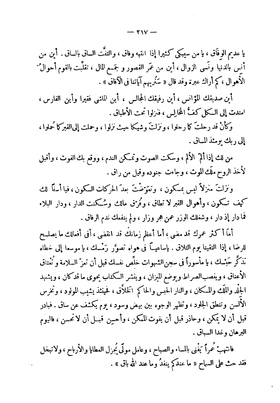 | يا عديم الوفاق , يا من سيبكي كثيراً إذا انتبه وفاق , والتفت الساق بالساق . أين من | أنس بالدنيا ونسي الزوال , أين من عمر القصور وجمع المال , تقلبت بالقوم أحوال | الأهوال , كم أراك عبرة وقد قال ! 2 < سنريهم آياتنا في الآفاق > 2 ! . | | أين صديقك المؤانس , أين رفيقك المجالس , أين الماشي فقيراً وأين الفارس , | امتدت إلى الكل كف المخالس , فنزلوا تحت الأطباق . | | وكأن قد رحلت كما رحلوا , ونزلت وشيكاً حيث نزلوا , وحملت إلى القبر كما حملوا , | إلى ربك يومئذ المساق . | | من لك إذا ألم الألم , وسكت الصوت وتمكن الندم , ووقع بك الفوت , وأقبل | لأخذ الروح ملك الموت , وجاءت جنوده وقيل من راق . | | ونزلت منزلاً ليس بمسكون , وتعوضت بعد الحركات السكون , فيا أسفاً لك | كيف تكون , وأهوال القبر لا تطاق , وفرق مالك وسكنت الدار , ودار البلاء | فما دار إذ دار , وشغلك الوزر عمن هجر وزار , ولم ينفعك ندم الرفاق . | | أما أكثر عمرك قد مضى , أما أعظم زمانك قد انقضى , أفي أفعالك ما يصلح | للرضا , إذا التقينا يوم التلاق , يا ساعياً في هواه تصور رمسك , يا موسعا إلى خطاه | تذكر حبسك , يا مأسوراً في سجن الشهوات خلص نفسك قبل أن تعز السلامة وتعتاق | الأعناق , وينصب الصراط ويوضع الميزان , وينشر الكتاب يحوي ما قد كان , ويشهد | الجلد والملك والمكان , والنار الحبس والحاكم الخلاق , فحينئذ يشيب المولود , وتخرس | الألسن وتنطق الجلود , وتظهر الوجوه بين بيض وسود , يوم يكشف عن ساق . فبادر | قبل أن لا يمكن , وحاذر قبل أن يفوت الممكن , وأحسن قبل أن لا تحسن , فاليوم | البرهان وغداً السباق . | | فانتهب عمراً يفنى بالمساء والصباح , وعامل مولى يجزل العطايا والأرباح , ولا تبخل | فقد حدث على السماح ! 2 < ما عندكم ينفد وما عند الله باق > 2 ! . |