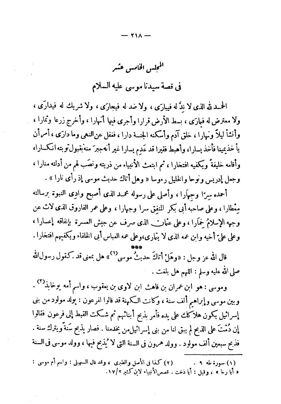 | المجلس الخامس عشر | في قصة سيدنا موسى عليه السلام | | الحمد لله الذي لا ند له فيبارى , ولا ضد له فيجارى , ولا شريك له فيدارى , | ولا معترض له فيمارى , بسط الأرض قراراً وأجرى فيها أنهارا , وأخرج زرعاً وثمارا , | وأنشأ ليلاً ونهارا , خلق آدم وأسكنه الجنة دارا , فغفل عن النهي وما دارى , أمر أن | يأخذ يميناً فأخذ يسارا , وأهبط فقيراً قد عدم يسارا غير أنه جبر منه بقبول توبته انكسارا , | وأقامه خليفة ويكفيه افتخارا , ثم ابتعث الأنبياء من ذريته ونصب لهم من أدلته منارا , | وجعل إدريس ونوحا والخليل رءوسا ! 2 < وهل أتاك حديث موسى إذ رأى نارا > 2 ! . | | أحمده سرا وجهارا , وأصلي على رسوله محمد الذي أصبح وادي النبوة برسالته | معطارا , وعلى صاحبه أبي بكر المنفق سرا وجهارا , وعلى عمر الفاروق الذي لاث عن | وجهه الإسلام خمارا , وعلى عثمان الذي صرف على جيش العسرة بإنفاقه إعسارا , | وعلى علي أخيه وابن عمه الذي لا يتمارى , وعلى عمه العباس أبي الخلفاء ويكفيهم افتخارا . | | قال الله عز وجل : ! 2 < وهل أتاك حديث موسى > 2 ! هل بمعنى قد . كقول رسول الله | صلى الله عليه وسلم : اللهم هل بلغت . | | وموسى : هو ابن عمران بن قاهث ابن لاوي بن يعقوب , واسم أمه يوخابذ . | وبين موسى وإبراهيم ألف سنة , وكانت الكهنة قد قالوا لفرعون : يولد مولود من بني | إسرائيل يكون هلاكك على يده فأمر بذبح أبنائهم ثم شكت القبط إلى فرعون فقالوا | إن دمت على الذبح لم يبق لنا من بني إسرائيل من يخدمنا . فصار يذبح سنة ويترك سنة . | فذبح سبعين ألف مولود . وولد هارون في السنة التي لا يذبح فيها , وولد موسى في السنة |