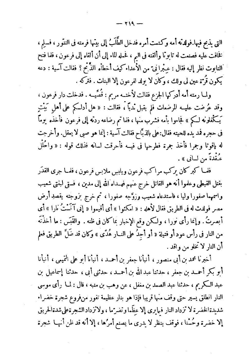 | التي يذبح فيها . فولدته أمه وكتمت أمره فدخل الطلب إلى بيتها فرمته في التنور , فسلم , | فخافت عليه فصنعت له تابوتاً وألقته في اليم , فحمله الماء إلى أن ألقاه إلى فرعون , فلما فتح | التابوت نظر إليه فقال : عبراني من الأعداء كيف أخطأه الذبح ! فقالت آسية : دعه | يكون قرة عين لي ولك , وكان لا يولد لفرعون إلا البنات . فتركه . | | ولما رمته أمه أدركها الجزع فقالت لأخته مريم : قصيه . فدخلت دار فرعون , | وقد عرضت عليه المرضعات , فلم يقبل ثدياً , فقالت : ' ! 2 < هل أدلكم على أهل بيت يكفلونه لكم > 2 ! ' فجاءوا بأمه فشرب منها , فلما تم رضاعه ردته إلى فرعون فأخذه يوماً | في حجره فمد يده للحيته فقال : علي بالذباح فقالت آسية : إنما هو صبي لا يعقل . وأخرجت | له ياقوتاً وجمراً فأخذ جمرة فطرحها في فيه فأحرقت لسانه فذلك قوله : ' واحلل | عقدة من لساني ' . | | فلما كبر كان يركب مراكب فرعون ويلبس ملابس فرعون , فلما جرى القدر | بقتل القبطي وعلموا أنه هو القاتل خرج عنهم فهداه الله إلى مدين , فسقى لبنتي شعيب | واسمهما صفورا وليا , فاستدعاه شعيب وزوجه صفوراً , ثم خرج بزوجتته يقصد أرض | مصر فولدت له في الطريق فقال لأهله : ' ! 2 < امكثوا > 2 ! ' أي أقيموا ' ! 2 < إني آنست نارا > 2 !ً ' أي | أبصرت . وإنما رأى نوراً , ولكن وقع الإخبار بما كان في ظنه . والقبس : ما أخذته | من النار في رأس عود أو فتيلة ! 2 < أو أجد على النار هدى > 2 ! وكان قد ضل الطريق فعلم | أن النار لا تخلو من واقد . | | أخبرنا محمد بن أبي منصور , أنبأنا جعفر بن أحمد , أنبأنا أبو علي التميمي , أنبأنا | أبو بكر أحمد بن جعفر , حدثنا عبد الله بن أحمد , حدثني أبي , حدثنا إسماعيل بن | عبد الكريم , حدثنا عبد الصمد بن مغفل , عن وهب بن منبه , قال : لما رأى موسى | النار انطلق يسير حتى وقف منها قريباً فإذا هو بنار عظيمة تفور من فروع شجرة خضراء | شديدة الخضرة لا تزداد النار فيما يرى إلا عظماً وتضرماً , ولا تزداد الشجرة على شدة الحريق | إلا خضرة وحسناً , فوقف ينظر لا يدري ما يصنع أمرها , إلا أنه قد ظن أنها شجرة |