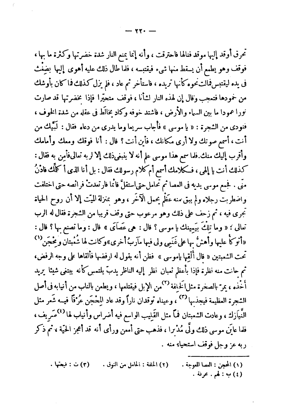 | تحرق أوقد إليها موقد فنالها فاحترقت , وأنه إنما يمنع النار شدة خضرتها وكثرة ما بها , | فوقف وهو يطمع أن يسقط منها شيء فيقتبسه , فلما طال ذلك عليه أهوى إليها بضغث | في يده ليقتبس فمالت نحوه كأنها تريده , فاستأخر ثم عاد , فلم يزل كذلك فما كان بأوشك | من خمودها فتعجب وقال إن لهذه النار لشأنا , فوقف متحيراً فإذا بخضرتها قد صارت | نوراً عموداً ما بين السماء والأرض , فاشتد خوفه وكاد يخالط في عقله من شدة الخوف , | فنودي من الشجرة : ' يا موسى ' فأجاب سريعاً وما يدري من دعاه فقال : لبيك من | أنت , أسمع صوتك ولا أرى مكانك , فأين أنت ؟ قال : أنا فوقك ومعك وأمامك | وأقرب إليك منك . فلما سمع هذا موسى علم أنه لا ينبغي ذلك إلا لربه تعالى فأمن به فقال : | كذلك أنت يا إلهي , فكلامك أسمع أم كلام رسولك فقال : بل أنا الذي أكلمك فادن | مني . فجمع موسى يديه في العصا ثم تحامل حتى استقل قائماً فارتعدت فرائصه حتى اختلفت | واضطربت رجلاه ولم يبق منه عظم يحمل الآخر , وهو بمنزلة الميت إلا أن روح الحياة | تجري فيه , ثم زحف على ذلك وهو مرعوب حتى وقف قريباً من الشجرة فقال له الرب | تعالى : ! 2 < وما تلك بيمينك يا موسى قال هي عصاي > 2 ! قال : وما تصنع بها ؟ قال : | ! 2 < أتوكأ عليها وأهش بها على غنمي ولي فيها مآرب أخرى > 2 ! وكانت لها شعبتان ومحجن | تحت الشعبتين ! 2 < قال ألقها يا موسى > 2 ! فظن أنه يقول له ارفضها فألقاها على وجه الرفض , | ثم حانت منه نظرة فإذا بأعظم ثعبان نظر إليه الناظر يدب يلتمس كأنه يبتغي شيئاً يريد | أخذه , يمر بالصخرة مثل الخلفة من الإبل فيقتلعها , ويطعن بالناب من أنيابه في أصل | الشجرة العظيمة فيجذبها , وعيناه توقدان ناراً وقد عاد المحجن عرفاً فيه شعر مثل | النيازك , وعادت الشعبتان فماً مثل القليب الواسع فيه أضراس وأنياب لها صريف , | فلما عاين موسى ذلك ولى مدبراً , فذهب حتى أمعن ورأى أنه قد أعجز الحية , ثم ذكر | ربه عز وجل فوقف استحياء منه . |