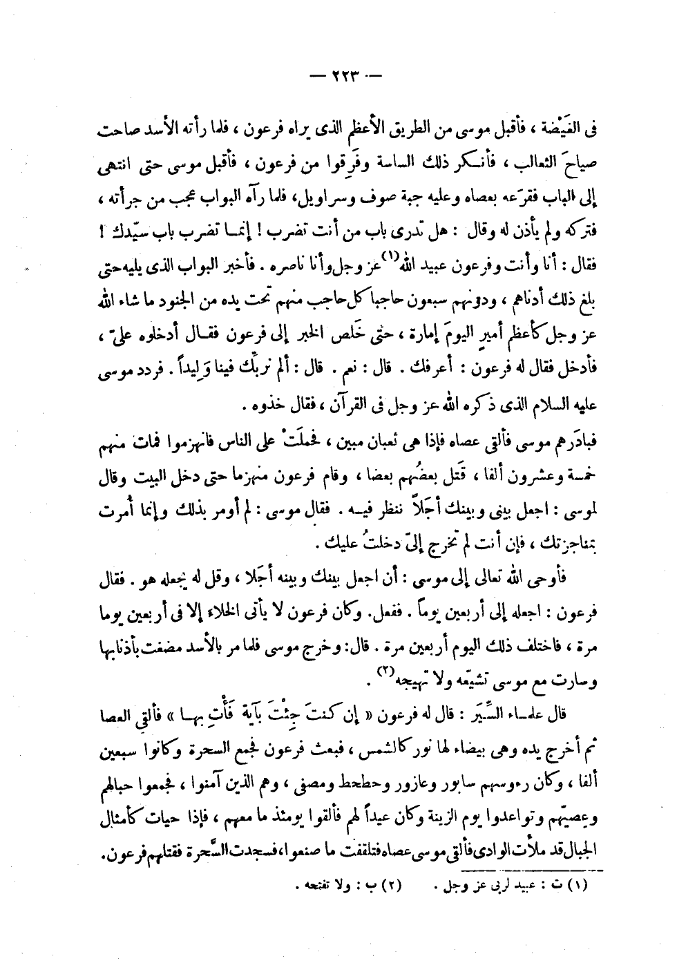 | في الغيضة , فأقبل موسى من الطريق الأعظم الذي يراه فرعون , فلما رأته الأسد صاحت | صياح الثعالب , فأنكر ذلك الساسة وفرقوا من فرعون , فأقبل موسى حتى انتهى | إلى الباب فقرعه بعصاه وعليه جبة صوف وسراويل , فلما رآه البواب عجب من جرأته , | فتركه ولم يأذن له وقال : هل تدري باب من أنت تضرب ! إنما تضرب باب سيدك ! | فقال : أنا وأنت وفرعون عبيد الله عز وجل وأنا ناصره . فأخبر البواب الذي يليه حتى | بلغ ذلك أدناهم , ودونهم سبعون حاجباً كل حاجب منهم تحت يده من الجنود ما شاء الله | عز وجل كأعظم أمير اليوم إمارة , حتى خلص الخبر إلى فرعون فقال أدخلوه علي , | فأدخل فقال له فرعون : أعرفك . قال : نعم . قال : ألم نربك فينا وليدا . فردد موسى | عليه السلام الذي ذكره الله عز وجل في القرآن , فقال : خذوه . | | فبادرهم موسى فألقى عصاه فإذا هي ثعبان مبين , فحملت على الناس فانهزموا فمات منهم | خمسة وعشرون ألفا , قتل بعضهم بعضا , وقام فرعون منهزماً حتى دخل البيت وقال | لموسى : اجعل بيني وبينك أجلا ننظر فيه . فقال موسى : لم أومر بذلك وإنما أمرت | بمناجزتك , فإن أنت لم تخرج إلي دخلت عليك . | | فأوحى الله تعالى إلى موسى : أن اجعل بينك وبينه أجلاً , وقل له يجعله هو . فقال | فرعون : اجعله إلى أربعين يوماً . ففعل . وكان فرعون لا يأتي الخلاء إلا في أربعين يوماً | مرة , فاختلف ذلك اليوم أربعين مرة . قال : وخرج موسى فلما مر بالأسد مضغت بأذنابها | وسارت مع موسى تشيعه ولا تهيجه . | | قال علماء السير : قال له فرعون ' ! 2 < إن كنت جئت بآية فأت بها > 2 ! ' فألقى العصا | ثم أخرج يده وهي بيضاء لها نور كالشمس , فبعث فرعون فجمع السحرة وكانوا سبعين | ألفا , وكان رءوسهم سابور وعازور وحطحط ومصفى , وهم الذين آمنوا , فجمعوا حبالهم | وعصيهم وتواعدوا يوم الزينة وكان عيداً لهم فألقوا يومئذ ما معهم , فإذا حيات كأمثال | الجبال قد ملأت الوادي فألقى موسى عصاه فتلقفت ما صنعوا , فسجدت السحرة فقتلهم فرعون . |
