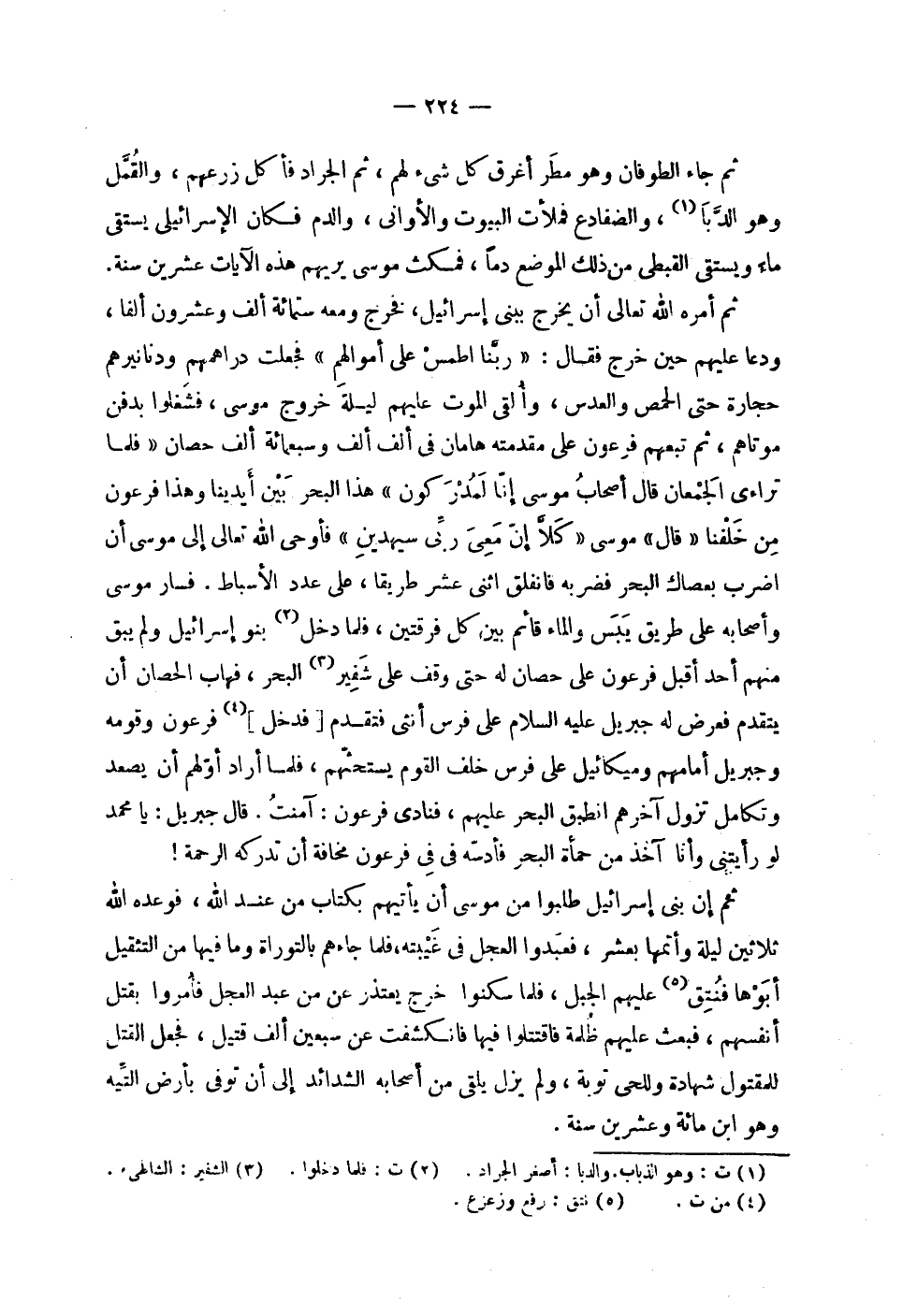 | | ثم جاء الطوفان وهو مطر أغرق كل شيء لهم , ثم الجراد فأكل زرعهم , والقمّل | وهو الدبا , والضفادع فملأت البيوت والأواني , والدم فكان الإسرائيلي يستقي | ماء ويستقي القبطي من ذلك الموضع دما , فمكث موسى يريهم هذه الآيات عشرين سنة . | | ثم أمره الله تعالى أن يخرج ببني إسرائيل , فخرج ومعه ستمائة ألف وعشرون ألفا , | ودعا عليهم حين خرج فقال : ! 2 < ربنا اطمس على أموالهم > 2 ! فجعلت دراهمهم ودنانيرهم | حجارة حتى الحمص والعدس , وألقى الموت عليهم ليلة خروج موسى , فشغلوا بدفن | موتاهم , ثم تبعهم فرعون على مقدمته هامان في ألف ألف وسبعمائة ألف حصان ! 2 < فلما تراءى الجمعان قال أصحاب موسى إنا لمدركون > 2 ! هذا البحر بين أيدينا وهذا فرعون | من خلفنا ^ ( قال ) ^ موسى ! 2 < كلا إن معي ربي سيهدين > 2 ! فأوحى الله تعالى إلى موسى أن | اضرب بعصاك البحر فضربه فانفلق اثني عشر طريقاً , على عدد الأسباط . فسار موسى | وأصحابه على طريق يبس والماء قائم بين كل فرقتين , فلما دخل بنو إسرائيل ولم يبق | منهم أحد أقبل فرعون على حصان له حتى وقف على شفير البحر , فهاب الحصان أن | يتقدم فعرض له جبريل عليه السلام على فرس أنثى [ فدخل ] فرعون وقومه | وجبريل أمامهم وميكائيل على فرس خلف القوم يستحثهم , فلما أراد أولهم أن يصعد | وتكامل نزول آخرهم انطبق البحر عليهم , فنادى فرعون : آمنت . قال جبريل : يا محمد | لو رأيتني وأنا آخذ من حمأة البحر فأدسه في فيّ فرعون مخافة أن تدركه الرحمة ! | | ثم إن بني إسرائيل طلبوا من موسى أن يأتيهم بكتاب من عند الله , فوعده الله | ثلاثين ليلة وأتمها بعشر , فعبدوا العجل في غيبته , فلما جاءهم بالتوراة وما فيها من التثقيل | أبوها فنتق عليهم الجبل , فلما سكنوا خرج يعتذر عن من عبد العجل فأمروا بقتل | أنفسهم , فبعث عليهم ظلمة فاقتتلوا فيها فانكشفت عن سبعين ألف قتيل , فجعل القتل | للمقتول شهادة وللحي توبة , ولم يزل يلقى من أصحابه الشدائد إلى أن توفي بأرض التيه | وهو ابن مائة وعشرين سنة . |