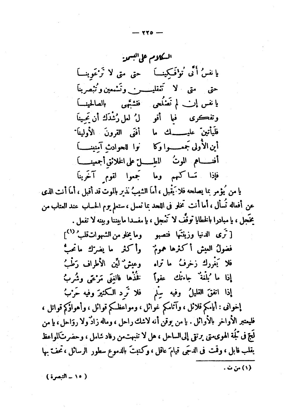 | الكلام على البسملة | | ( يا نفس أنى تؤفكينا % حتى متى لا ترعوينا ) % | | ( حتى متى لا تعقلين % وتسمعين وتبصرينا ) % | | ( يا نفس إن لم تصلحي % فتشبهي بالصالحينا ) % | | ( وتفكري فيما أقول % لعل رشدك أن يحينا ) % | | ( فليأتين عليك ما % أفنى القرون الأولينا ) % | | ( أين الأُولى جمعوا وكانوا % للحوادث آمنينا ) % | | ( أفناهم الموت المطل % على الخلائق أجمعينا ) % | | ( فإذا مساكنهم وما % جمعوا لقوم آخرينا ) % | | يا من يؤمر بما يصلحه فلا يقبل , أما الشيب نذير بالموت قد أقبل , أما أنت الذي | عن أفعاله تسأل , أما أنت تخلو في اللحد بما تعمل , ستعلم يوم الحساب عند العتاب من | يخجل , يا مبادرا بالخطايا توقف لا تعجل , يا مفسدا ما بيننا وبينه لا تفعل . | | [ ( ترى الدنيا وزينتها فتصبو % وما يخلو من الشهوات قلب ) % ] | | ( فضول العيش أكثرها هموم % وأكثر ما يضرك ما تحب ) % | | ( فلا يغررك زخرف ما تراه % وعيش لين الأطراف رطب ) % | | ( إذا ما بلغة جاءتك عفوا % فخذها فالغنى مرعى وشرب ) % | | ( إذا اتفق القليل وفيه سلم % فلا ترد الكثير وفيه حرب ) % | | إخواني : أيامكم قلائل , وآثامكم غوائل , ومواعظكم قوائل , وأهواؤكم قواتل , | فليعتبر الأواخر بالأوائل . يا من يوقن أنه لا شك راحل , وما له زاد ولا رواحل , يا من | لج في لجة الهوى متى يرتقي إلى الساحل , هل لا تنبهت من رقاد شامل , وحضرت المواعظ | بقلب قابل , وقمت في الدجى قيام عاقل , وكتبت بالدموع سطور الرسائل , تحف بها |