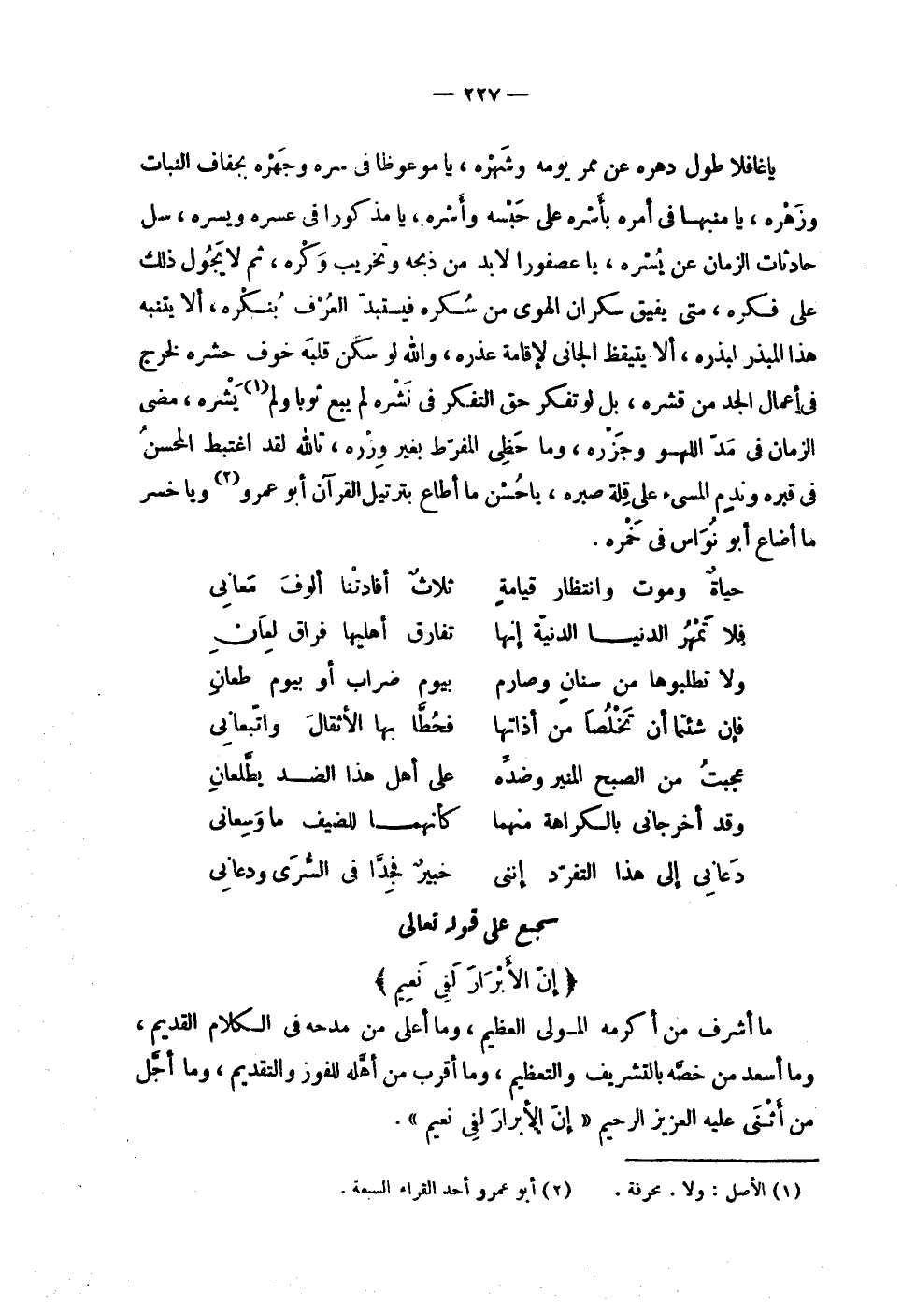 | | يا غافلاً طول دهره عن ممر يومه وشهره , يا موعوظاً في سره وجهره بجفاف النبات | وزهره , يا منبها في أمره بأسره على حبسه وأسره , يا مذكورا في عسره ويسره , سل | حادثات الزمان عن يسره , يا عصفورا لا بد من ذبحه وتخريب وكره , ثم لا يجول ذلك | على فكره , متى يفيق سكران الهوى من سكره فيستبد العرف بنكره , ألا يتنبه | هذا المبذر لبذره , ألا يتيقظ الجاني لإقامة عذره , والله لو سكن قلبه خوف حشره لخرج | في أعمال الجد من قشره , بل لو تفكر حق التفكر في نشره لم يبع ثوبا ولم يشره , مضى | الزمان في مد اللهو وجزره , وما حظي المفرط بغير وزره , تالله لقد اغتبط المحسن | في قبره وندم المسيء على قلة صبره , بأحسن ما أطاع بترتيل القرآن أبو عمرو ويا خسر | ما أضاع أبو نواس في خمره . | | ( حياة وموت وانتظار قيامة % ثلاث أفادتنا ألوف معاني ) % | | ( فلا تمهر الدنيا الدنية إنها % تفارق أهليها فراق لعان ) % | | ( ولا تطلبوها من سنان وصارم % بيوم ضراب أو بيوم طعان ) % | | ( فإن شئتما أن تخلصا من أذاتها % فحطا بها الأثقال واتبعاني ) % | | ( عجبت من الصبح المنير وضده % على أهل هذا الضد يطلعان ) % | | ( وقد أخرجاني بالكراهة منهما % كأنهما للضيف ما وسعاني ) % | | ( دعاني إلى هذا التفرد إنني % خبير فجدا في السرى ودعاني ) % | سجع على قوله تعالى | ! 2 < إن الأبرار لفي نعيم > 2 ! | ما أشرف من أكرمه المولى العظيم , وما أعلى من مدحه في الكلام القديم , | وما أسعد من خصه بالتشريف والتعظيم , وما أقرب من أهله للفوز والتقديم , وما أجل | من أثنى عليه العزيز الرحيم ! 2 < إن الأبرار لفي نعيم > 2 ! . |