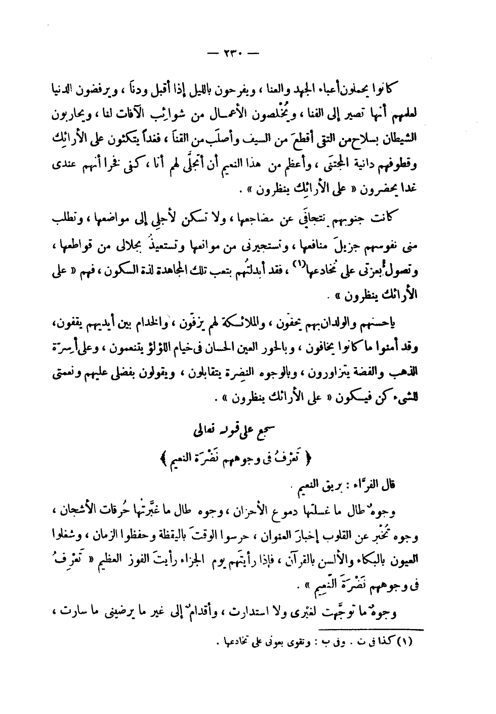 | | كانون يحملون أعباء الجهد و العنا , و يفرحون بالليل إذا أقبل ودنا , ويرفضون الدنيا | لعلمهم أنها تصير إلى الفنا , ويخلصون الأعمال من شوائب الآفات لنا , ويحاربون | الشيطان بسلاح من التقى أقطع من السيف وأصلب من القنا , فغداً يتكئون على الأرائك | وقطوفهم دانية المجتنى , وأعظم من هذا النعيم أن أتجلى لهم أنا , كفى فخراً أنهم عندي | غداً يحضرون ! 2 < على الأرائك ينظرون > 2 ! . | | كانت جنوبهم تتجافى عن مضاجعها , ولا تسكن لأجلي إلى مواضعها , وتطلب | مني نفوسهم جزيل منافعها , وتستجيرني من موانعها وتستعيذ بجلالي من قواطعها , | وتصول بعزتي على مخادعها , فقد أبدلتهم بتعب تلك المجاهدة لذة السكون , فهم ! 2 < على الأرائك ينظرون > 2 ! . | | يا حسنهم والولدان بهم يحفون , والملائكة لهم يزفون , والخدام بين أيديهم يقفون , | وقد أمنوا ما كانوا يخافون , وبالحور العين الحسان في خيام اللؤلؤ يتنعمون , وعلى أسرة | الذهب والفضة يتزاورون , وبالوجوه النضرة يتقابلون , ويقولون بفضلي عليهم ونعمتي | للشيء كن فيكون ! 2 < على الأرائك ينظرون > 2 ! . | سجع على قوله تعالى | ! 2 < تعرف في وجوههم نضرة النعيم > 2 ! | قال الفراء : بريق النعيم . | | وجوه طال ما غسلتها دموع الأحزان , وجوه طال ما غبرتها حرقات الأشجان , | وجوه تخبر عن القلوب إخبار العنوان , حرسوا الوقت باليقظة وحفظوا الزمان , وشغلوا | العيون بالبكاء والألسن بالقرآن , فإذا رأيتهم يوم الجزاء رأيت الفوز العظيم ! 2 < تعرف في وجوههم نضرة النعيم > 2 ! . | | وجوه ما توجهت لغيري ولا استدارت , وأقدام إلى غير ما يرضيني ما سارت , |