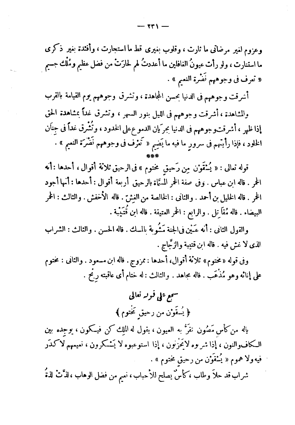 | وعزوم لغير مرضاتي ما ثارت , وقلوب بغيري قط ما استجارت , وأفئدة بغير ذكري | ما استنارت , ولو رأت عيون الغافلين ما أعددت لهم لحارت من فضل عظيم وملك جسيم | ! 2 < تعرف في وجوههم نضرة النعيم > 2 ! . | | أشرقت وجوههم في الدنيا بحسن المجاهدة , وتشرق وجوههم يوم القيامة بالقرب | والمشاهدة , أشرقت وجوههم في الليل بنور السهر , وتشرق غداً بمشاهدة الحق | إذا ظهر , أشرقت وجوههم في الدنيا بجريان الدموع على الخدود , وتشرق غداً في جنان | الخلود , فإذا رأيتهم في سرور ما فيه ما يضيم ! 2 < تعرف في وجوههم نضرة النعيم > 2 ! . | | قوله تعالى : ! 2 < يسقون من رحيق مختوم > 2 ! في الرحيق ثلاثة أقوال , أحدها : أنه | الخمر . قاله ابن عباس . وفي صفة الخمر المسماة بالرحيق أربعة أقوال : أحدها : أنها أجود | الخمر . قاله الخليل بن أحمد . والثاني : الخالصة من الغش . قاله الأخفش . والثالث : الخمر | البيضاء . قاله مقاتل . والرابع : الخمر العتيقة . قاله ابن قتيبة . | | والقول الثاني : أنه عين في الجنة مشوبة بالمسك . قاله الحسن . والثالث : الشراب | الذي لا غش فيه . قاله ابن قتيبة والزجاج . | | وفي قوله ! 2 < مختوم > 2 ! ثلاثة أقوال , أحدها : ممزوج . قاله ابن مسعود . والثاني : مختوم | على إنائه وهو مذهب . قاله مجاهد . والثالث : له ختام أي عاقبته ربح . | سجع على قوله تعالى | ! 2 < يسقون من رحيق مختوم > 2 ! | يا له من كأس مصون تقر به العيون , يقول له الملك كن فيكون , يوجده بين | الكاف والنوم , إذا شربوه لا يحزنون , إذا استوعبوه لا يسكرون , نعيمهم لا كدر | فيه ولا هموم ! 2 < يسقون من رحيق مختوم > 2 ! . | | شراب قد حلا وطاب , كأس يصلح للأحباب , نعيم من فضل الوهاب , لذت لذة |