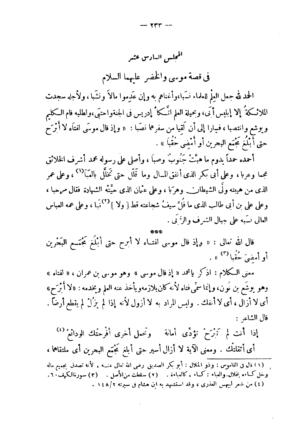 | المجلس السادس عشر | في قصة موسى والخضر عليهما السلام | | الحمد لله جعل العلم للعلماء نسبا , وأغناهم به وإن عدموا مالاًَ ونشباً , ولأجله سجدت | الملائكة إلا إبليس أبى , وبحيلة العلم اتكأ إدريس في الجنة واحتبى , ولطلبه قام الكليم | ويوشع وانتصبا , فسارا إلى أن لقيا من سفرهما نصبا : ! 2 < وإذ قال موسى لفتاه لا أبرح حتى أبلغ مجمع البحرين أو أمضي حقبا > 2 ! . | | أحمده حمداً يدوم ما هبت جنوب وصباً , وأصلي على رسوله محمد أشرف الخلائق | عجماً وعربا , وعلى أبي بكر الذي أنفق المال وما قلل حتى تخلل بالعبا , وعلى عمر | الذي من هيبته ولى الشيطان وهربا , وعلى عثمان الذي حيته الشهادة فقال مرحباً , | وعلى علي بن أبي طالب الذي ما فل سيف شجاعته قط [ ولا ] نبا , وعلى عمه العباس | العالي نسبه على جبال الشرف والربى . | | قال الله تعالى : ! 2 < وإذ قال موسى لفتاه لا أبرح حتى أبلغ مجمع البحرين أو أمضي حقبا > 2 ! . | | معنى الكلام : اذكر يا محمد ^ ( إذا قال موسى ) ^ وهو موسى بن عمران , ! 2 < لفتاه > 2 ! | وهو يوشع بن نون , وإنما سمي فتاه لأنه كان يلازمه ويأخذ عنه العلم ويخدمه : ! 2 < لا أبرح > 2 ! | أي لا أزال , أي لا أنفك . وليس المراد به لا أزول لأنه إذا لم يزل لم يقطع أرضاً . | قال الشاعر : | | ( إذا أنت لم تبرح تؤدي أمانة % وتحمل أخرى أفرحتك الودائع ) % | | أي أثقلتك . ومعنى الآية لا أزال أسير حتى أبلغ مجمع البحرين أي ملتقاهما , |