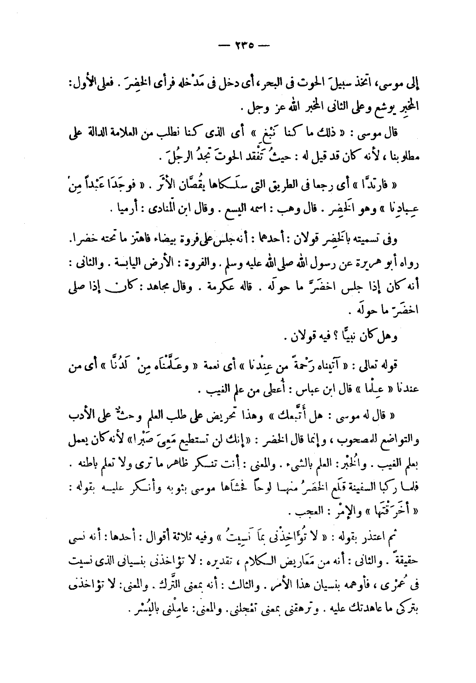 | إلى موسى , اتخذ سبيل الحوت في البحر , أي دخل في مدخله فرأى الخضر . فعلى الأول : | المخبر يوشع وعلى الثاني المخبر الله عز وجل . | | قال موسى : ' ! 2 < ذلك ما كنا نبغ > 2 ! ' أي الذي كنا نطلب من العلامة الدالة على | مطلوبنا , لأنه كان قد قيل له : حيث تفقد الحوت تجد الرجل . | | ! 2 < فارتدا > 2 ! أي رجعا في الطريق التي سلكاها يقصان الأثر . ! 2 < فوجدا عبدا من عبادنا > 2 ! وهو الخضر . قال وهب : اسمه اليسع . وقال ابن المنادى : أرميا . | | وفي تسميته بالخضر قولان : أحدهما : أنه جلس على فروة بيضاء فاهتز ما تحته خضرا . | رواه أبو هريرة عن رسول الله صلى الله عليه وسلم . والفروة : الأرض اليابسة . والثاني : | أنه كان إذا جلس اخضر ما حوله . قاله عكرمة . وقال مجاهد : كان إذا صلى | اخضر ما حوله . | | وهل كان نبياً ؟ فيه قولان : | | قوله تعالى : ! 2 < آتيناه رحمة من عندنا > 2 ! أي نعمة ! 2 < وعلمناه من لدنا > 2 ! أي من | عندنا ! 2 < علما > 2 ! قال ابن عباس : أعطي من علم الغيب . | | ! 2 < قال له موسى هل أتبعك > 2 ! وهذا تحريض على طلب العلم وحث على الأدب | والتواضع المصحوب , وإنما قال الخضر : ! 2 < إنك لن تستطيع معي صبرا > 2 ! لأنه كان يعمل | بعلم الغيب . والخبر : العلم بالشيء . والمعنى : أنت تنكر ظاهر ما ترى ولا تعلم باطنه . | فلما ركبا السفينة قلع الخضر منها لوحاً فحشاها موسى بثوبه وأنكر عليه بقوله : | ! 2 < أخرقتها > 2 ! والإمر : العجب . | | ثم اعتذر بقوله : ! 2 < لا تؤاخذني بما نسيت > 2 ! وفيه ثلاثة أقوال : أحدها : أنه نسي | حقيقة . والثاني : أنه من معاريض الكلام , تقديره : لا تؤاخذني بنسياني الذي نسيت | في عمري , فأوهمه بنسيان هذا الأمر . والثالث : أنه بمعنى الترك . والمعنى : لا تؤاخذني | بتركي ما عاهدتك عليه . وترهقني بمعنى تعجلني . والمعنى : عاملني باليسر . |