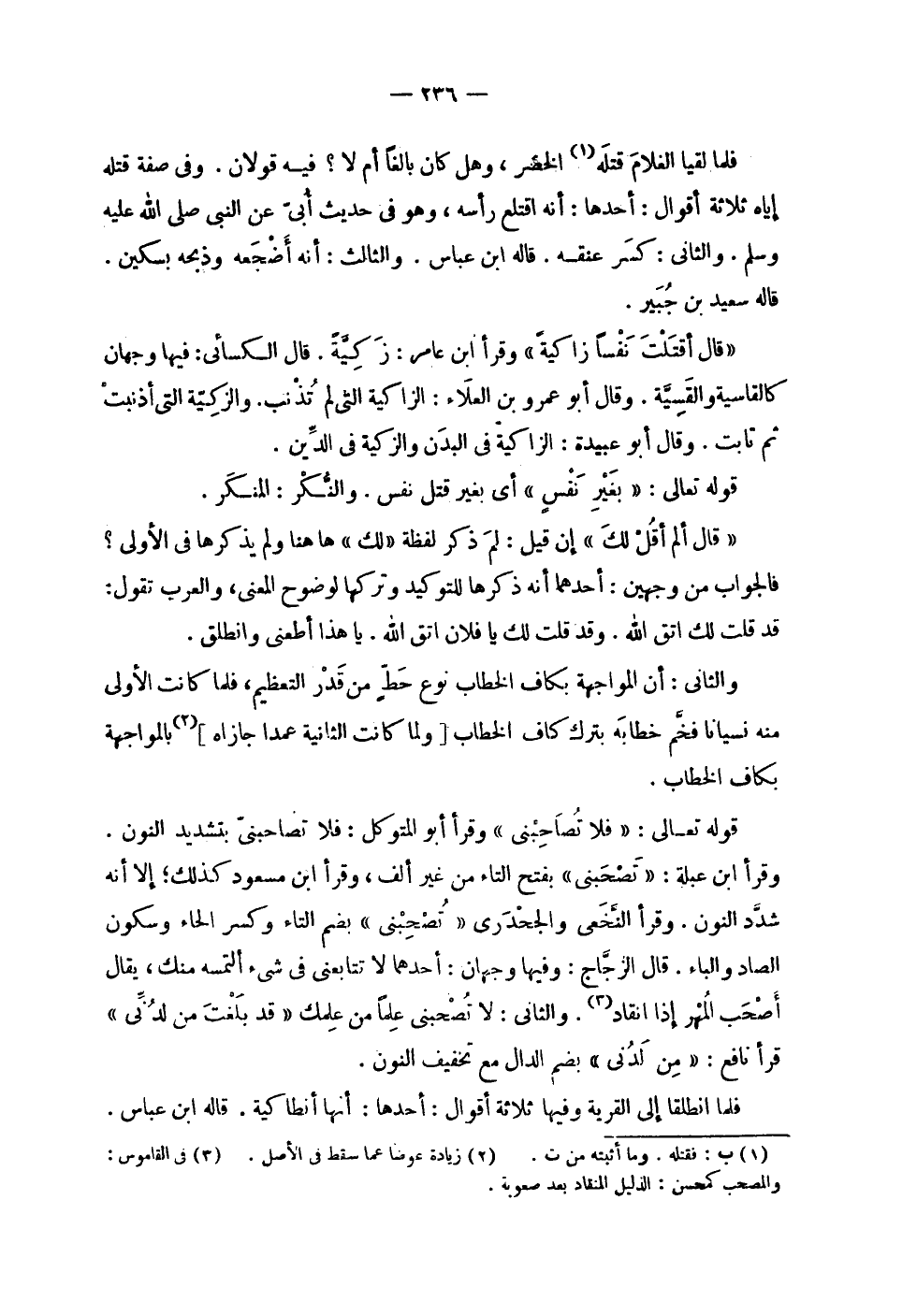 | | فلما لقيا الغلام قتله الخضر , وهل كان بالغاً أم لا ؟ فيه قولان . وفي صفة قتله | إياه ثلاثة أقوال : أحدها : أنه اقتلع رأسه , وهو في حديث أبي عن النبي صلى الله عليه وسلم . | والثاني : كسر عنقه . قاله ابن عباس : والثالث : أنه أضجعه وذبحه بسكين . | قاله سعيد بن جبير . | | ^ ( قال أقتلت نفساً زاكية ) ^ وقرأ ابن عامر : زكية . قال الكسائي : فيها وجهان | كالقاسية والقسية . وقال أبو عمرو بن العلاء : الزاكية التي لم تذنب . والزكية التي أذنبت | ثم تابت . وقال أبو عبيدة : الزاكية في البدن والزكية في الدين . | | قوله تعالى : ! 2 < بغير نفس > 2 ! أي بغير قتل نفس , والنكر : المنكر . | | ! 2 < قال ألم أقل لك > 2 ! إن قيل : لم ذكر لفظة ! 2 < لك > 2 ! ها هنا ولم يذكرها في الأولى ؟ | فالجواب من وجهين : أحدهما أنه ذكرها للتوكيد وتركها لوضوح المعنى , والعرب تقول : | قد قلت لك اتق الله . وقد قلت لك يا فلان اتق الله . يا هذا أطعني وانطلق . | | والثاني : أن المواجهة بكاف الخطاب نوع حط من قدر التعظيم , فلما كانت الأولى | منه نسياناً فخم خطابه بترك كاف الخطاب [ ولما كانت الثانية عمداً جازاه ] بالمواجهة | بكاف الخطاب . | | قوله تعالى : ! 2 < فلا تصاحبني > 2 ! وقرأ أبو المتوكل : فلا تصاحبني بتشديد النون . | وقرأ ابن عبلة : ^ ( تصحبني ) ^ بفتح التاء من غير ألف , وقرأ ابن مسعود كذلك ؛ إلا أنه | شدد النون . وقرأ النخعي والجحدري ^ ( تصحبني ) ^ بضم التاء وكسر الحاء وسكون | الصادر والباء . قال الزجاج : وفيها وجهان : أحدهما لا تتابعني في شيء ألتمسه منك , يقال | أصبحت المهر إذا إنقاذ . والثاني : لا تصحبني علماً من علمك ! 2 < قد بلغت من لدني > 2 ! | قرأ نافع : ! 2 < من لدني > 2 ! بضم الدال مع تخفيف النون . | | فلما انطلقا إلى القرية وفيها ثلاثة أقوال : أحدها : أنها أنطاكية . قاله ابن عباس . |