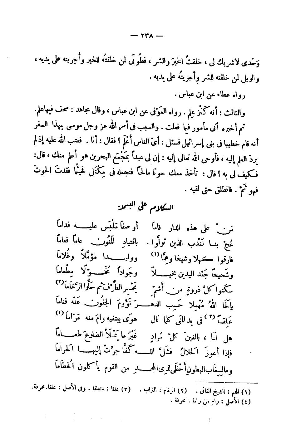| وحدي لا شريك لي , خلقت الخير والشر , فطوبى لمن خلقته للخير وأجريته على يديه , | والويل لمن خلقته للشر وأجريته على يديه . | | رواه عطاء عن ابن عباس . | | والثالث : أنه كنز علم . رواه العوفي عن ابن عباس , وقال مجاهد : صحف فيها علم . | | ثم أخبره أني مأمور فيما فعلت . والسبب في أمر الله عز وجل موسى بهذا السفر | أنه قام خطيباً في بني إسرائيل فسئل : أي الناس أعلم ؟ فقال : أنا . فعتب الله عليه إذ لم | يرد العلم إليه , فأوحى الله تعالى إليه : إن لي عبداً بمجمع البحرين هو أعلم منك , قال : | فكيف لي به ؟ قال : تأخذ معك حوتاً مالحاً فتجعله في مكتل فحيثما فقدت الحوت | فهو ثتم . فانطلق حتى لقيه . | الكلام على البسملة | | ( من على هذه الدار قاما % أو صفا ملبس عليه فداما ) % | | ( عد بنا نندب الذين تولوا % باقتياد المنون عاماً فعاماً ) % | | ( فارقوا كهلاً وشيخاً وهما % ووليداً مؤملاً وغلاماً ) % | | ( وشحيحاً جعد اليدين بخيلاً % وجواداً مخولاً مطعاما ) % | ( سكنوا كل ذروة من أشم % يحسر الطرف ثم حلوا الرغاما ) % | | ( يالحا الله مهلاً حسب الدهر لؤوم الجفون عنه فناما % ) % | | ( علقاً في يد المنى كلما نال % هوى يبتغيه رام منه مراماً ) % | | ( هل لنا , بالغين كل مراد % غير ما يملأ الضلوع طعاماً ) % | | ( فإذا أعوز الحلال فشل الله كفا جرت إليها الحراما % ) % | | ( وما لسغاب البطون أحظى لذي المجد من القوم يأكلون الخطاما % ) % |
