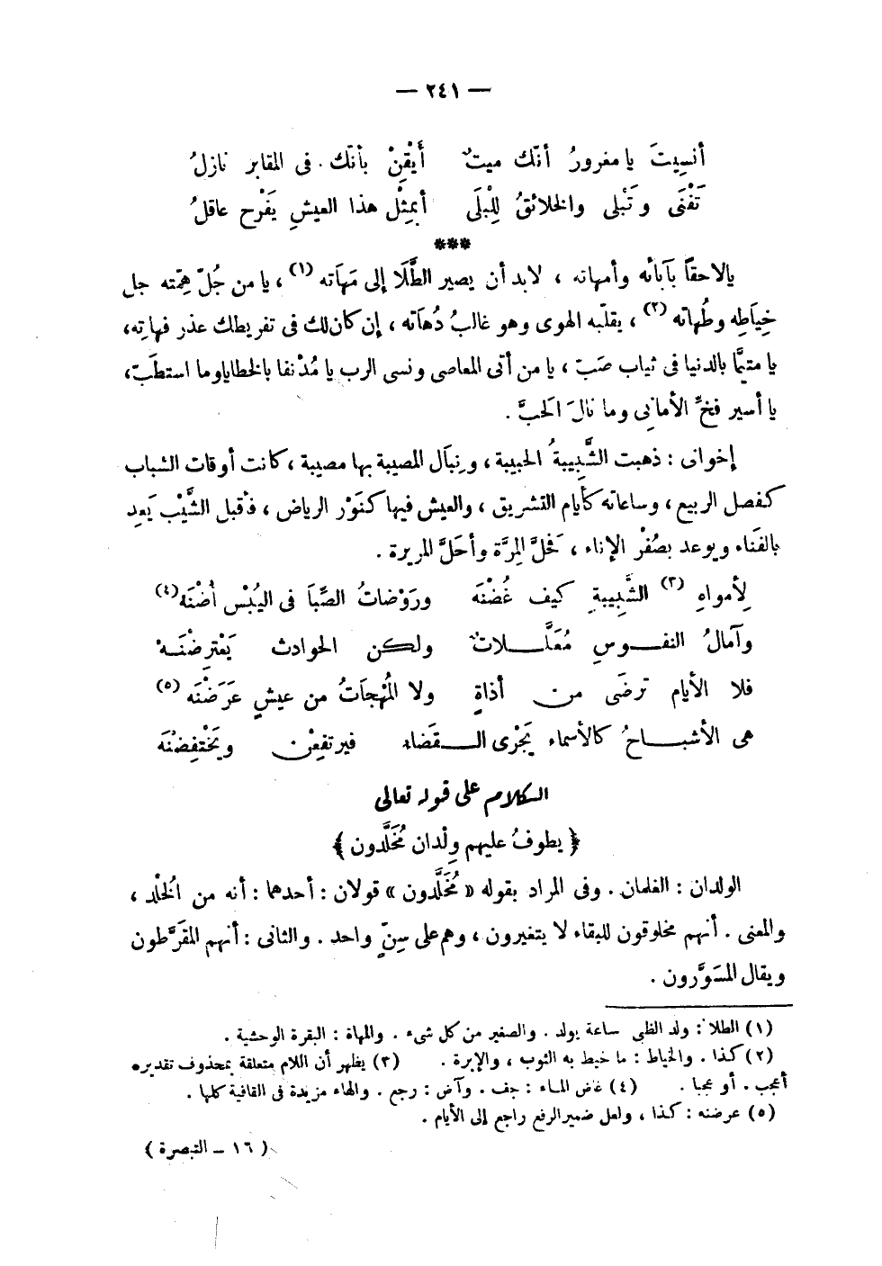 | | ( أنسيت يا مغرور أنك ميت % أيقن بأنك في المقابر نازل ) % | | ( تفنى وتبلى والخلائق للبلى % أبمثل هذا العيش يفرح عاقل ) % | | يا لاحقاً بآبائه وأمهاته , لا بد أن يصير الطلا إلى مهاته , يا من جل همته جل | خياطه وطهاته , يقلبه الهوى وهو غالب دهاته , إن كان لك في تفريطك عذر فهاته , | يا متيماً بالدنيا في ثياب صب , يا من أتى المعاصي ونسي الرب يا مدنقاً بالخطايا وما استطب , | يا أسير فخ الأماني وما نال الحب . | | إخواني : ذهبت الشبيبة الحبيبة , ونبال المصيبة بها مصيبة , كانت أوقات الشباب | كفصل الربيع , وساعاته كأيام التشريق , والعيش فيها كنوز الرياض , فأقبل الشيب يعد | بالفناء ويوعد بصغر الإناء , فحل المرة وأحل المريرة . | | ( لأمواه الشبيبة كيف غضنه % وروضات الصبا في اليبس أضنه ) % | | ( وآمال النفوس معللات % ولكن الحوادث يعترضنه ) % | | ( فلا الأيام ترضى من أذاة % ولا المهجات من عيش عرضنه ) % | | ( هي الأشباح كالأسماء يجري القضاء % فيرتفعن ويختفضنه ) % | الكلام على قوله تعالى | ! 2 < يطوف عليهم ولدان مخلدون > 2 ! | الولدان : الغلمان . وفي المراد بقوله ! 2 < مخلدون > 2 ! قولان : أحدهما : أنه من الخلد , | والمعنى . أنهم مخلوقون للبقاء لا يتغيرون , وهم على سن واحد . والثاني : أنهم المقرطون | ويقال المسورون . |