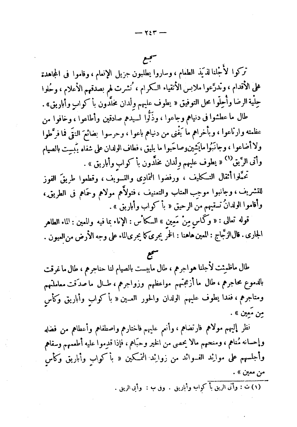 | سجع | | تركوا لأجلنا لذيذ الطعام , وساروا يطلبون جزيل الإنعام , وقاموا في المجاهدة | على الأقدام , وتدرعوا ملابس الأتقياء الكرام , نشرت لهم بصدقهم الأعلام , وحلوا | حلية الرضا وأحلوا محل التوفيق ! 2 < يطوف عليهم ولدان مخلدون بأكواب وأباريق > 2 ! . | | طال ما عطشوا في دنياهم وجاعوا , وذلوا لسيدهم صادقين وأطاعوا , وخافوا من | عظمته وارتاعوا , وبأخراهم ما يفنى من دنياهم باعوا , وحرسوا بضائع التقى فما فرطوا | ولا أضاعوا , وجانبوا ما يشين وصاحبوا ما يليق , فطاف الولدان على شفاه يبست بالصيام | وأتى الريق ! 2 < يطوف عليهم ولدان مخلدون بأكواب وأباريق > 2 ! . | | تحملوا أثقال التكليف , ورفضوا التمادي والتسويف , وقطعوا طريق الفوز | للتشريف , وجانبوا موجب العتاب والتعنيف , فتولاهم مولاهم وحماهم في الطريق , | وأقاموا الولدان تسقيهم من الرحيق ! 2 < بأكواب وأباريق > 2 ! . | | قوله تعالى : ! 2 < وكأس من معين > 2 ! الكأس : الإناء بما فيه والمعين : الماء الطاهر | الجاري . قال الزجاج : المعين ها هنا : الخمر يجري كما يجري الماء على وجه الأرض من العيون . | سجع | | طال ما ظمئت لأجلنا هواجرهم , طال ما يبست بالصيام لنا حناجرهم , طال ما غرقت | بالدموع محاجرهم , طال ما أزعجتهم مواعظهم وزواجرهم , طال ما صدقت معاملتهم | ومتاجرهم , فغدا يطوف عليهم الولدان والحور العين ! 2 < بأكواب وأباريق وكأس من معين > 2 ! . | | نظر إليهم مولاهم فارتضاهم , وأنعم عليهم فاختارهم واصطفاهم وأعطاهم من فضله | وإحسانه مناهم , ومنحهم مالا يحصى من الخير وحباهم , فإذا قدموا عليه أطعمهم وسقاهم | وأجلسهم على موائد الفوائد من زوائد التمكين ! 2 < بأكواب وأباريق وكأس من معين > 2 ! . |