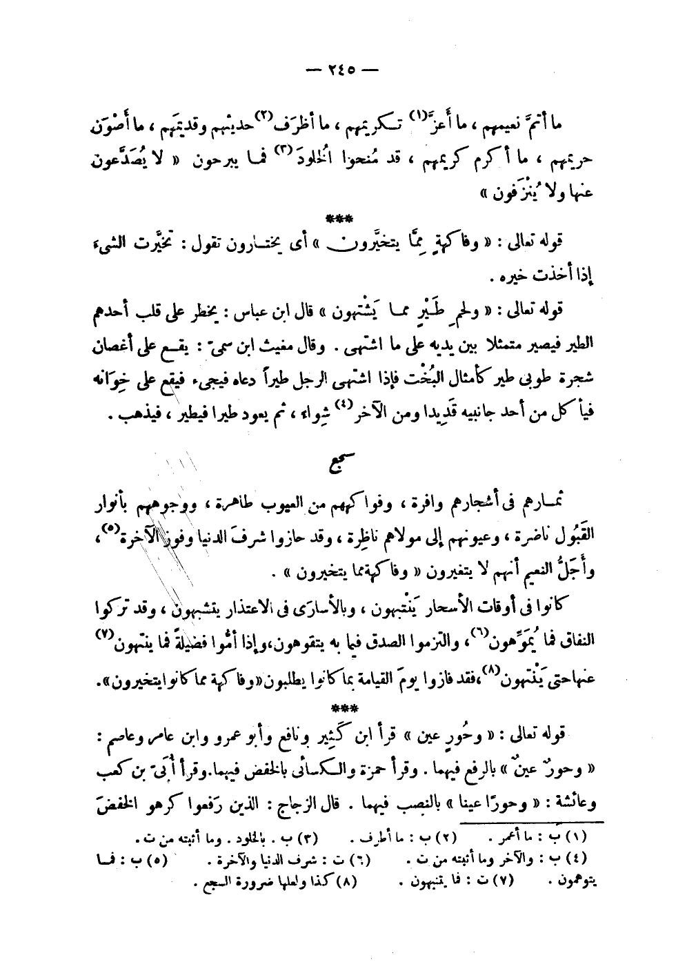 | | ما أتم نعيمهم , ما أعز تكريمهم , ما أظرف حديثهم وقديمهم , ما أصون | حريمهم , ما أكرم كريمهم , قد منحوا الخلود فما يبرحون ! 2 < لا يصدعون عنها ولا ينزفون > 2 ! . | | قوله تعالى : ! 2 < وفاكهة مما يتخيرون > 2 ! أي يختارون تقول : تخيرت الشيء | إذا أخذت خيره . | | قوله تعالى : ! 2 < ولحم طير مما يشتهون > 2 ! قال ابن عباس : يخطر على قلب أحدهم | الطير فيصير متمثلا بين يديه على ما اشتهى . وقال مغيث ابن سمي : يقع على أغصان | شجرة طوبى طير كأمثال البخت فإذا اشتهى الرجل طيراً دعاه فيجيء فيقع على خوانه | فيأكل من أحد جانبيه قديداً ومن الآخر شواء , ثم يعود طيراً فيطير , فيذهب . | سجع | | ثمارهم في أشجارهم وافرة , وفواكههم من العيوب طاهرة , ووجوههم بأنوار | القبول ناضرة , وعيونهم إلى مولاهم ناظرة , وقد حازوا شرف الدنيا وفوز الآخرة , | وأجل النعيم أنهم لا يتغيرون ! 2 < وفاكهة مما يتخيرون > 2 ! . | | كانوا في أوقات الأسحار ينتبهون , وبالأسارى في الاعتذار يتشبهون , وقد تركوا | النفاق فما يموهون , والتزموا الصدق فيما به يتفوهون , وإذا أموا فضيلةً فما ينتهون | عنها حتى ينتهون , فقد فازوا يوم القيامة بما كانوا يطلبون ! 2 < وفاكهة مما يتخيرون > 2 ! . | | قوله تعالى : ! 2 < وحور عين > 2 ! قرأ ابن كثير ونافع وأبو عمرو وابن عامر وعاصم : | ! 2 < وحور عين > 2 ! بالرفع فيهما . وقرأ حمزة والكسائي بالخفض فيهما . وقرأ أبي بن كعب | وعائشة : ' وحوراً عينا ' بالنصب فيهما . قال الزجاج : الذين رفعوا كرهوا الخفض |